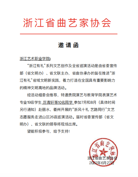 为深入贯彻落实《浙江高质量发展建设共同富裕示范区实施方案》和《关于推进“浙江有礼”省域文明新实践的实施意见》,倡导全社会践行“浙风十礼”,让人民群众更好地享受文化发展成果,7月上旬,演艺与教育学院应邀参加“浙风十礼·艺路同行”文化志愿服务活动,以自身行动争当“浙风十礼”的传承者、践行者和传播者。