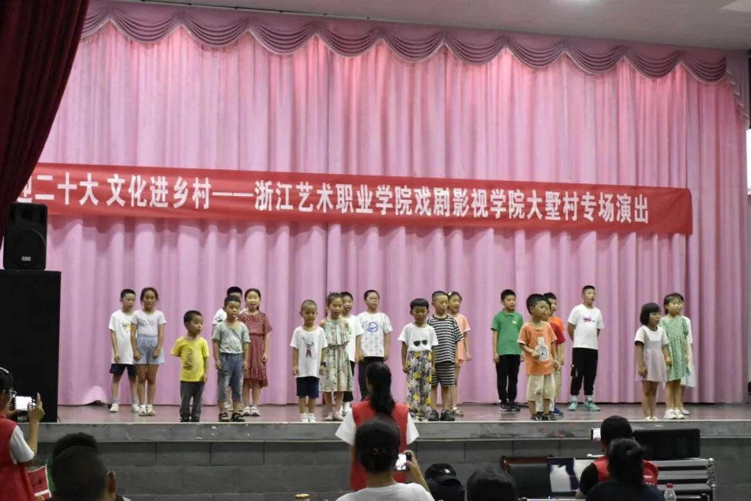 现场进行了“浙艺青年说”理论宣讲,在大墅村留下了浙艺学子坚定有力的青春之声。全体演员们与村民们齐唱《没有共产党就没有新中国》,用歌声表达对党的无限热爱,对祖国的美好祝愿。