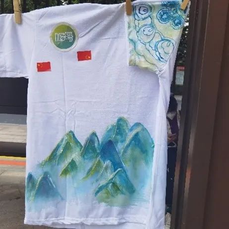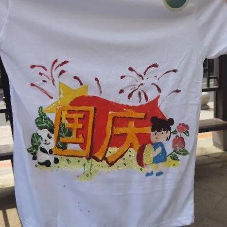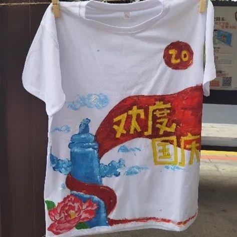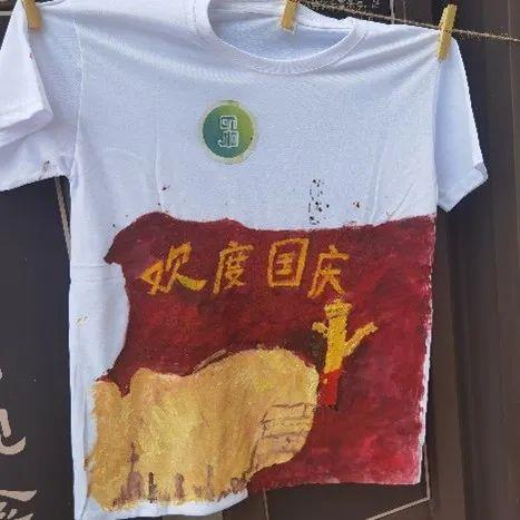 同学们用手中的彩笔在白色T恤上描绘出自己心中美丽的祖国,表达自己对伟大祖国的热爱之情和美好祝福。