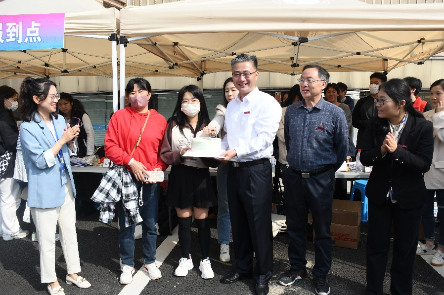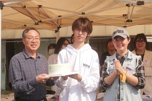 在戏剧影视学院迎新报到点,学校党委书记薛亮、分院领导班子成员为当天生日的新生送上生日蛋糕与祝福,并慰问在迎新一线的工作人员和志愿者,详细了解报到注册情况,与前来报到的新生亲切交谈,与师生合照留影。