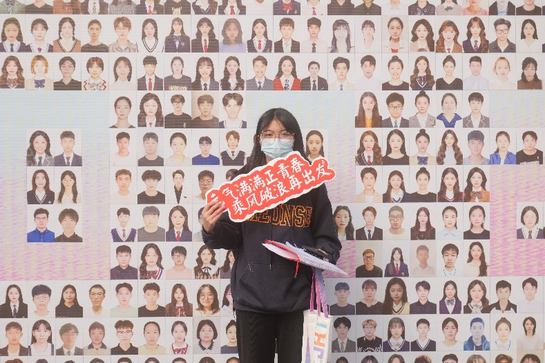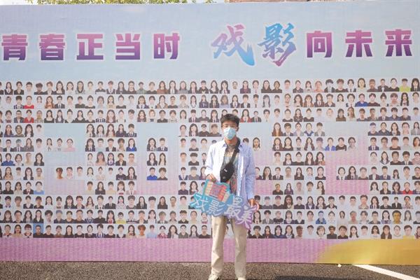 新生们手持各式KT板在背景板前打卡留念,在背景板上寻找自己的面孔,在“学生证”前留下入校的第一张照片。
