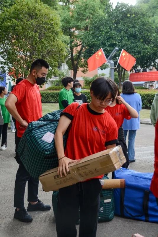 热情的学生党员和志愿者们身穿七彩T恤,积极接待新同学,答疑解惑、指引道路、搬运行李,帮助新生顺利完成各项报到手续。