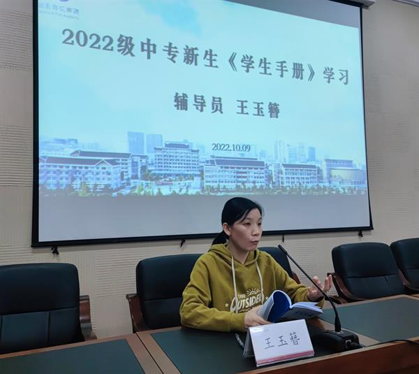辅导员王玉簪带领新生们一起学习《中专学生手册》,重点向新生们解读了“课堂教学秩序管理办法”“违纪处分条例”“公寓管理办法”“走读管理规定”等。