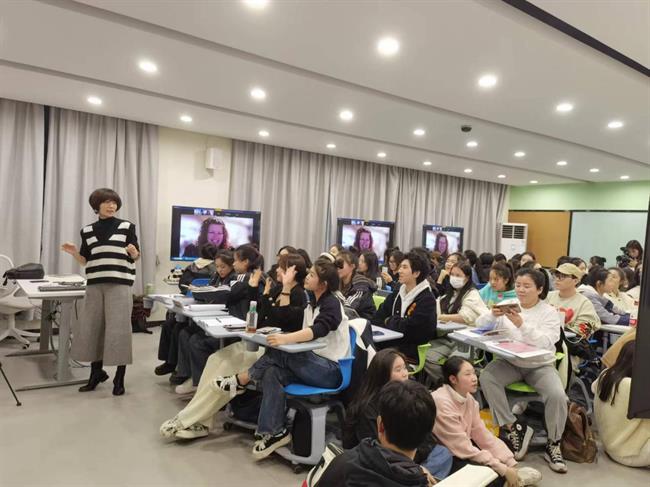 科琳·奈斯以“歌唱声音的产生”“音乐剧的演唱技术”为主要内容展开讲座,为大家深入浅出地讲授了音乐剧演唱时的发音要领以及灵活运用声音的技巧。两场讲座,科琳·奈斯共邀请了28位同学分别上台演唱一首音乐剧或歌曲片段。她对学生的演唱表示肯定和表扬,并针对每个学生的不足给予一对一指导。师生们学习情绪高涨,距离讲座开始半个小时,教室已经座无虚席,门口、过道聚满了学生,甚至有不少席地而坐。讲座途中,大家与科琳·奈斯积极互动,现场气氛活跃,反响热烈。章小敏在讲座结束后表示,经过科琳·奈斯细致入微的讲解,学生们的演唱在短时间内都有了明显的改进和提高。