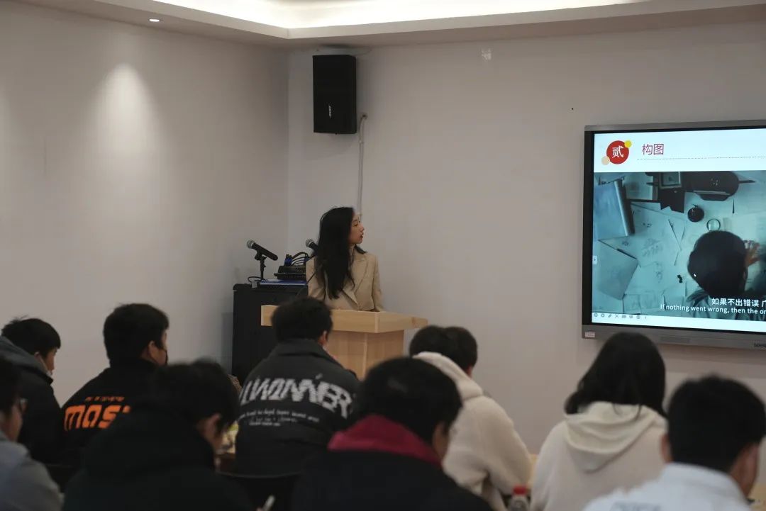 讲座伊始,邱奕雯以“电影艺术”为切入点,讲述了画面构成的要素,围绕“景别”的概念,以主旋律电影《我和我的祖国》为例,讲解了景别运用的重要性。她从画面中主体范围和视觉距离变化两方面区分了远景、全景、中景、近景、特写,以图片和视频相结合的方式直观展现学习重点,深入浅出的教学方式帮助同学们能够更好地理解抽象概念。
