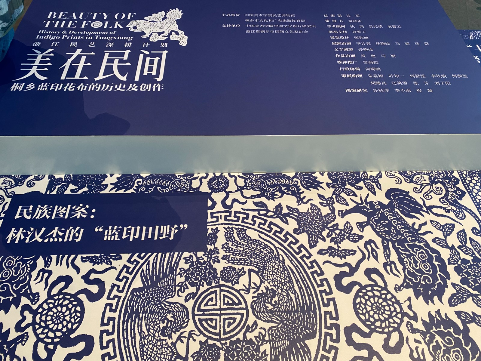 “美在民间——桐乡蓝印花布的历史及创作”展以桐乡蓝印花布的历史发展演进为脉络,分成“民族图案:林汉杰的‘蓝印田野’”“走向非遗:蓝印花布的近现代发展”“新‘丰同裕’:哀警卫的继承与探索”三大模块,比较全面地展现了桐乡蓝印花布在历史浪潮中自我发展,自我更新的过程与风貌。