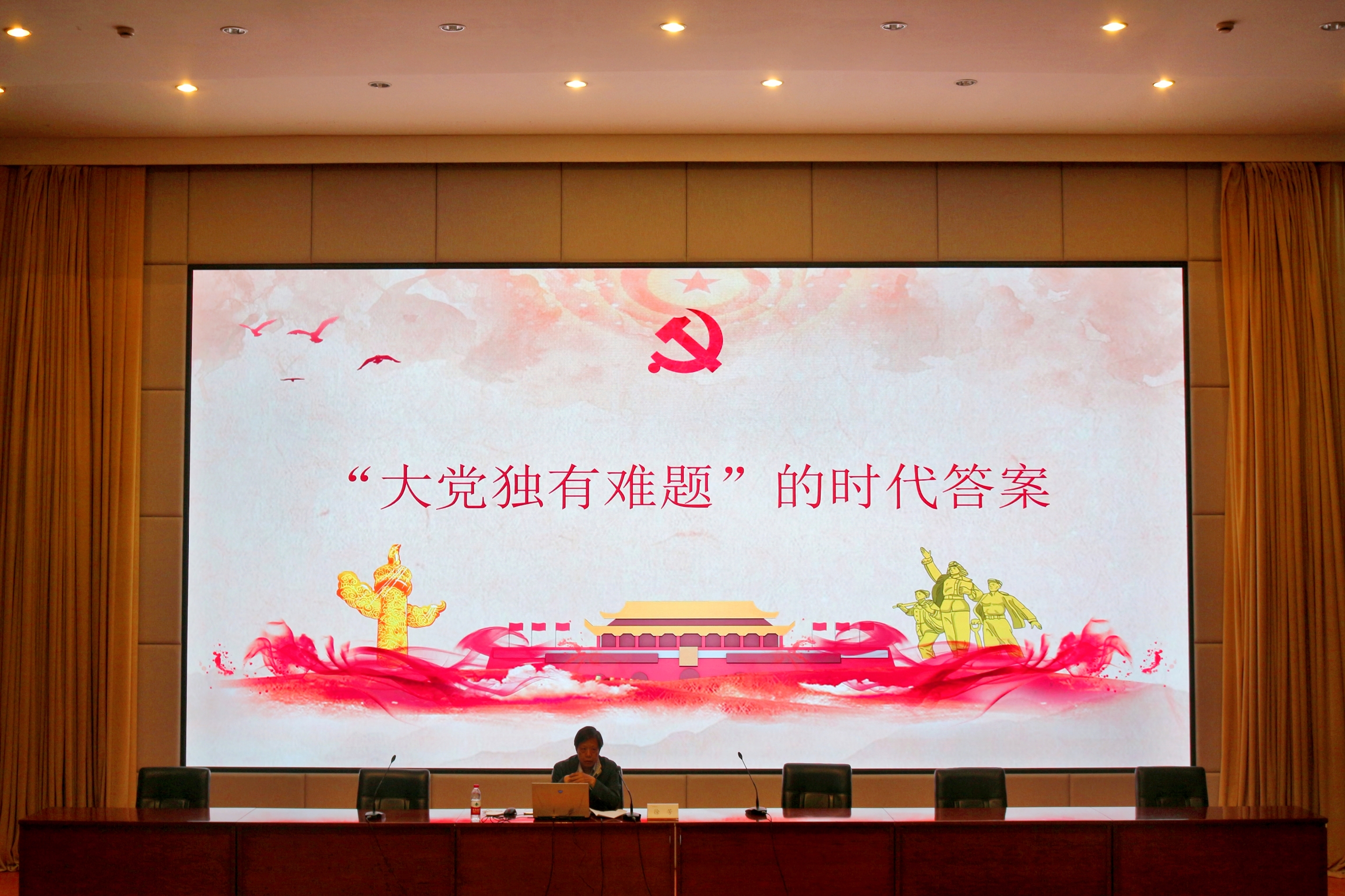 徐芳以《“大党独有难题”的时代答案》为题,结合主题教育相关要求,就大党独有难题的历史经验和时代内涵、提出大党独有难题的时代原因、破解大党独有难题的时代答案等三个方面与现场教师进行分享交流。