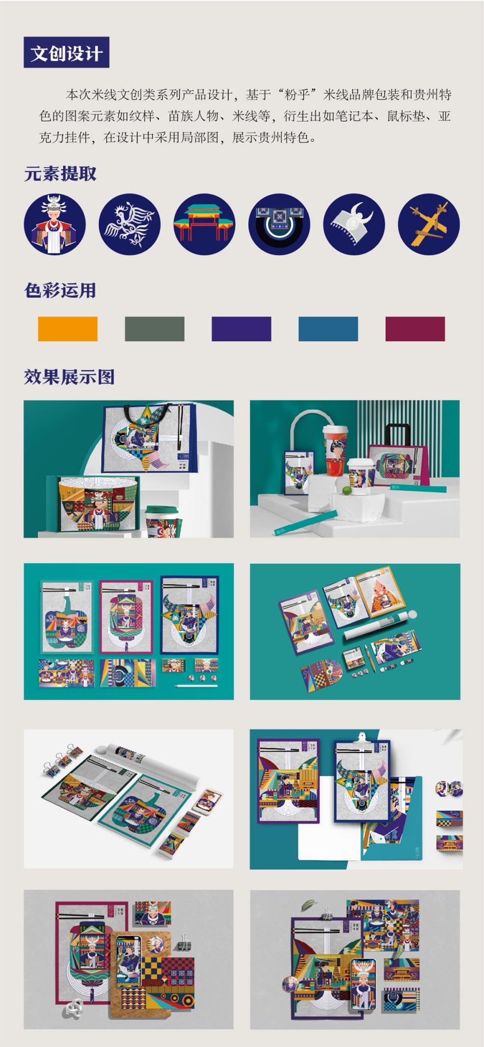 设计说明:课题对贵州当地特色米线--“粉乎”米线品牌进行整体形象系列打造和文创应用,以非遗文化传承与弘扬为主线,将贵州特色手工米粉浸渍、蒸煮、压榨等制作流程和工艺为主要元素,并结合当地建筑景点、服饰纹样、民俗文化、传统工艺等多方面背景,呈现多元性与多样性的贵州文化特征。通过抽象的现代几何风格,不同文化元素组合再造,协助贵州米线“粉乎”品牌,并进行一系列文创产品的开发与应用,助力贵州特色米线产品的市场拓展发展。