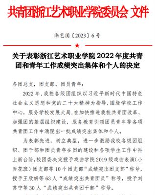 近日,共青团浙江艺术职业学院委员会发文表彰了2022年度浙江艺术职业学院共青团和青年工作成绩突出集体和个人,戏剧影视学院2021级影视制片与管理班团支部、2021级音像技术班团支部获评“成绩突出团支部”。