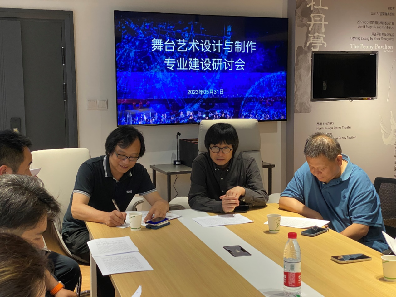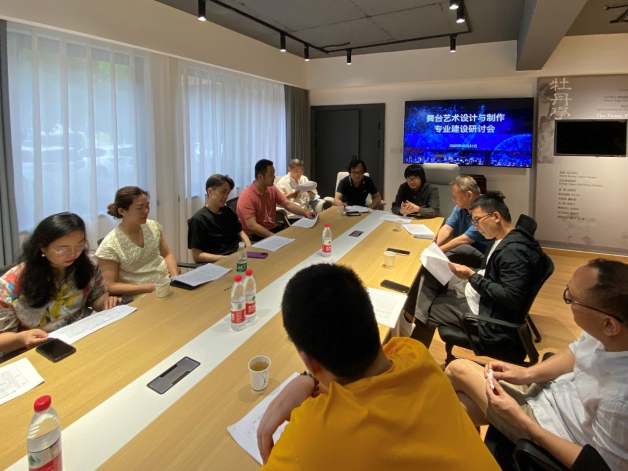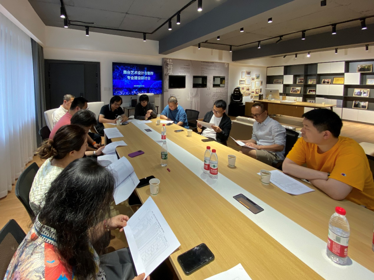 设计学院第三届“哲·艺”学术月通过专题讲座、专业研讨会、走访博物馆、校企合作签约等活动,进一步开阔师生知识眼界,营造良好学术氛围,推动专业建设。为优化专业结构,促进专业建设内涵式发展,进一步提升人才培养质量,6月2日,设计学院在周正平舞台美术导师工作室召开了舞台艺术设计与制作专业建设研讨会。会议邀请浙江京昆艺术剧院一级舞美设计裘冰,浙江天瀚文化发展股份有限公司董事长、一级舞美设计丁卫,浙江传媒学院设计艺术学院副教授张凯出席。设计学院党总支书记汪琳、常务副院长李昌国、舞台艺术设计与制作教研室主任叶文志和全体专业教师参加。会议由叶文志主持。