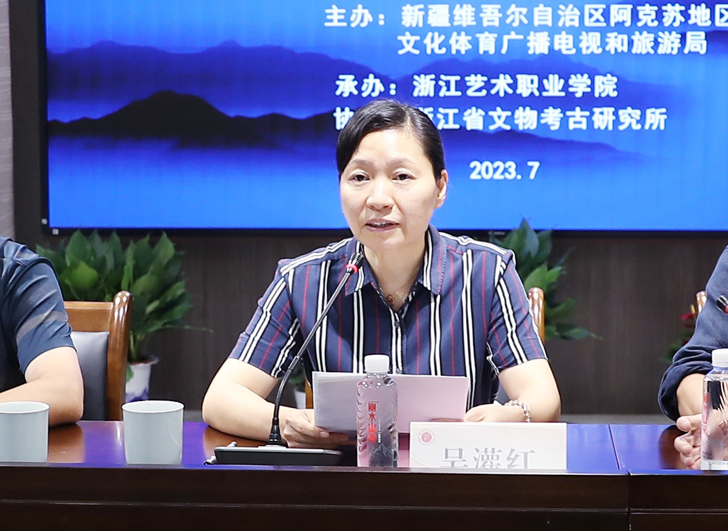 吴灌红致欢迎辞。她首先对浙江省援疆指挥部、阿克苏地区文化体育广播电视和旅游局对我院培训工作的支持与信任表示衷心感谢,向来自阿克苏文旅系统、考古文物领域的同仁们表示热烈的欢迎和诚挚的问候,也对浙江省文物考古研究所的大力支持和鼎力协助表示感谢。随后就近年来我校在人才培养、科学研究、社会服务等方面的工作成效,特别是我校与阿克苏地区开展文化交流活动结下的深厚情谊做了简要的介绍。吴灌红表示,本次培训班的举办背景正是根据习近平总书记的指示,要加强考古工作和历史研究,让收藏在博物馆里的文物、陈列在广阔大地上的遗产、书写在古籍里的文字都活起来,丰富全社会历史文化滋养。她强调,学院高度重视本期培训班,科学安排教学课程、精心设计教学内容,教学管理团队将全力做好项目实施和后勤保障等各项工作,确保培训实效。