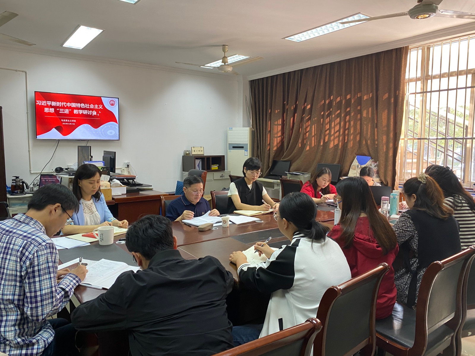 为贯彻落实《全面推进“大思政课”建设的工作方案》文件精神,深入推进习近平新时代中国特色社会主义思想进课堂、进教材、进头脑工作,10月19日,马克思主义学院组织召开习近平新时代中国特色社会主义思想“三进”教学研讨会。党委委员、宣传部部长、统战部部长马向东,马克思主义学院领导班子及全体思政教师参加会议。