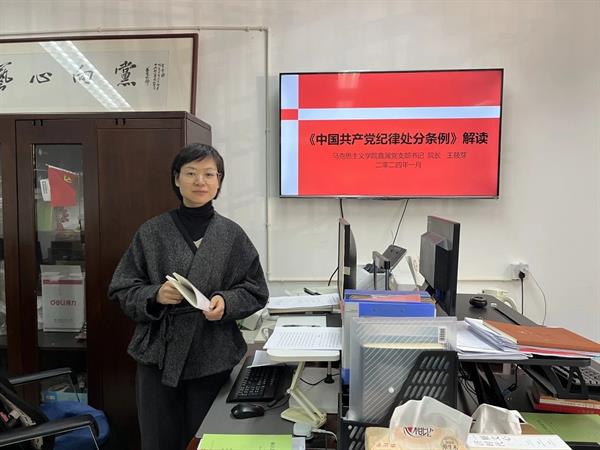 1月17日下午,马克思主义学院直属党支部开展理论学习中心组扩大学习会暨师德师风专题党课。直属党支部书记、院长王筱芽传达学习领会习近平在二十届中央纪委三次全会上发表重要讲话精神、新修订的《中国共产党纪律处分条例》,并集中观看由中央纪委国家监委宣传部与中央广播电视总台央视联合摄制的年度反腐大片《持续发力 纵深推进》。