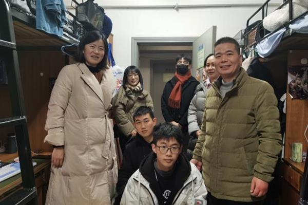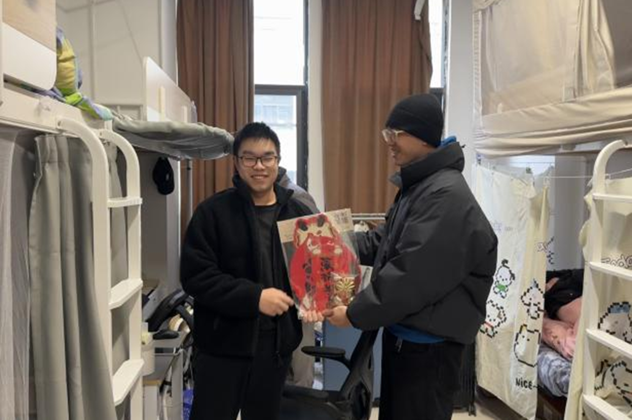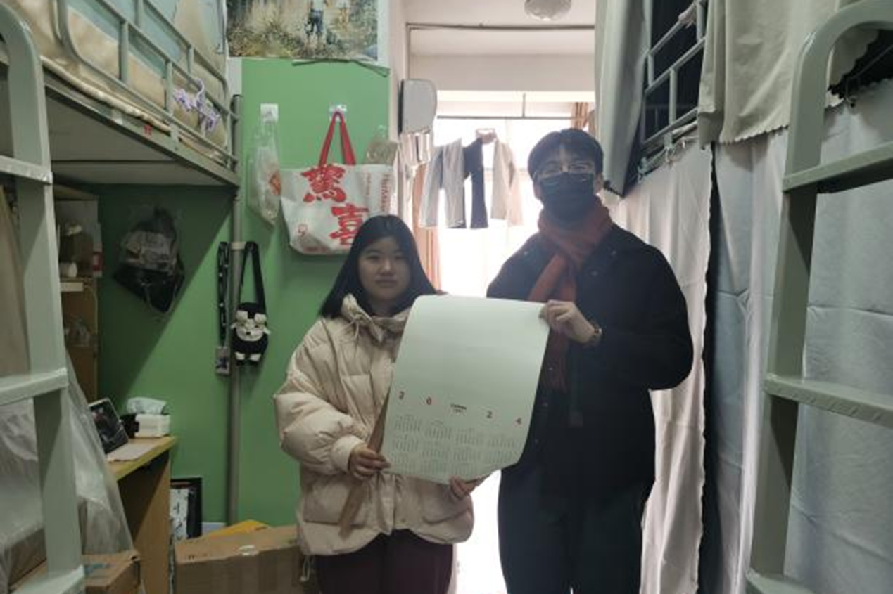 设计学院领导班子、全体班主任和辅导员走访学生寝室,细心查看宿舍环境,关注每一位学生的返校情况,询问学生的学习生活需求,为学生送上关怀,叮嘱学生认真完成劳动教育,保持整洁干净的寝室卫生环境。老师们还精心准备了富含龙年元素的春联、挂件,写满了对学生的美好寄语,让浓浓的年味与深深的人文关怀交织在一起。
