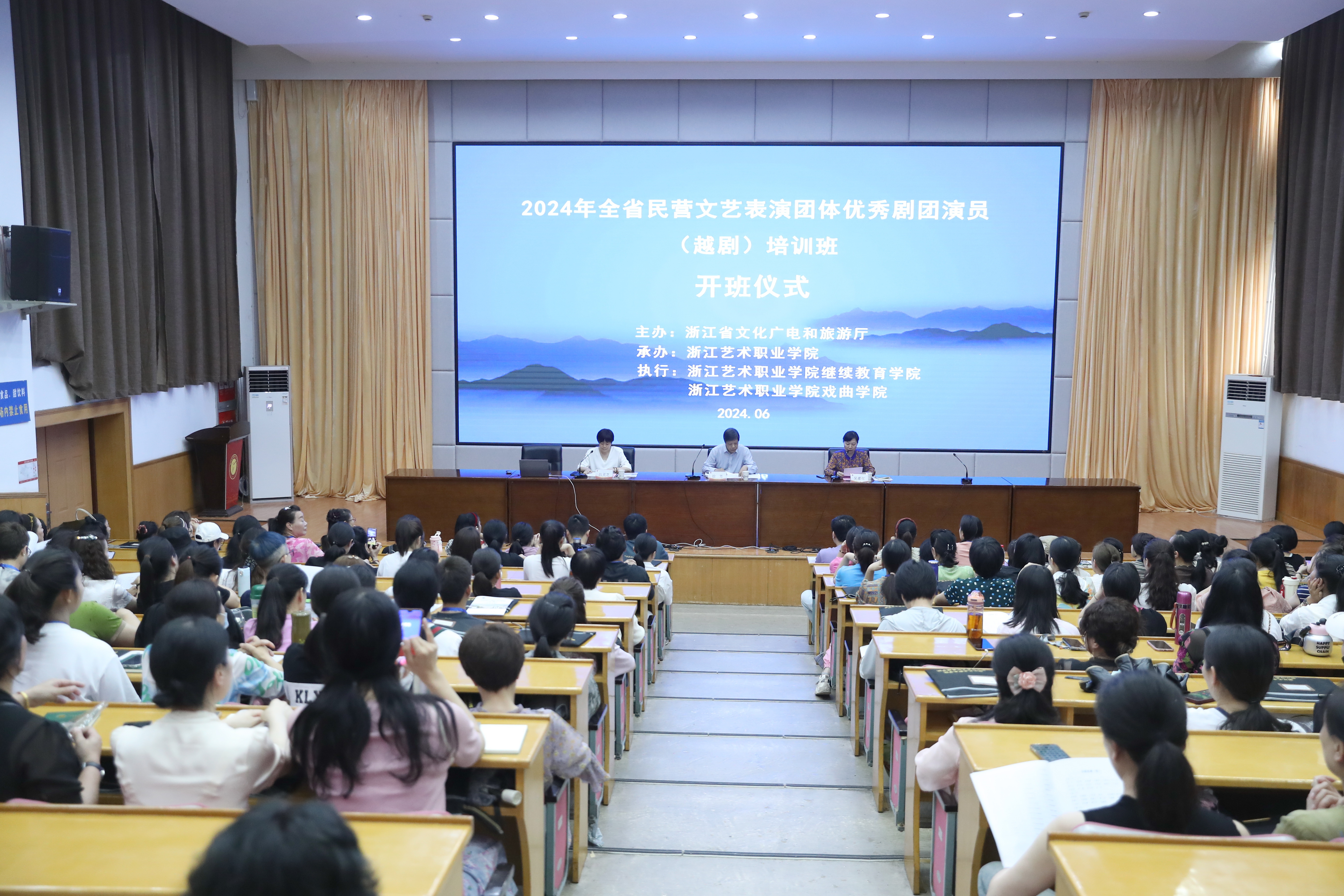 6月27日下午,由浙江省文化广电和旅游厅主办、浙江艺术职业学院承办、浙艺戏曲学院和继续教育学院共同执行承办的全省民营文艺表演团体优秀剧团演员(越剧)培训班(第一、二期)在我校开班,来自全省各地民营文艺表演团体的近200名越剧演员(花旦、小生)参加培训。我校党委委员、副校长徐芳,继续教育学院院长吴灌红、戏曲学院副院长吕灵芝出席开班仪式。开班仪式由吴灌红主持。