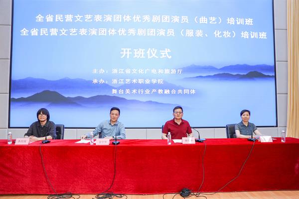 在音乐党课开始前,2025年全省民营文艺表演团体优秀剧团演员曲艺培训班和服装、化妆培训班举行了开班仪式。培训班由省文化广电和旅游厅主办,浙江艺术职业学院承办,来自全省民营文艺表演团体近90位学员参加培训。省文化广电和旅游厅艺术处二级调研员金宇华,浙江艺术职业学院党委委员、组织部部长周应中,设计学院院长李昌国出席开班式,继续教育学院院长吴灌红主持开班式。