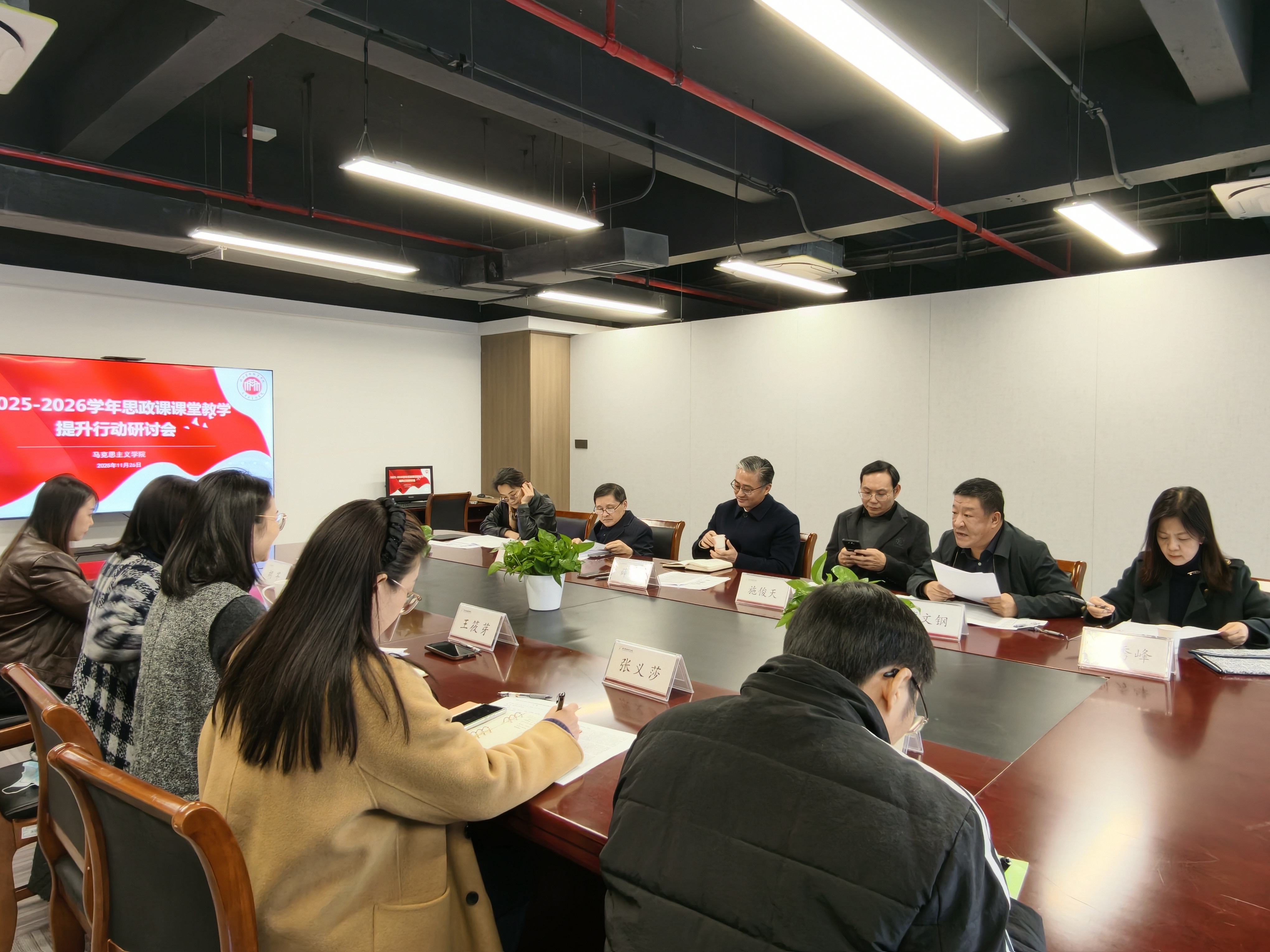 党委书记薛亮指出,从中央到省里再到学校,始终高度重视思政课建设,马院近年来队伍不断壮大、教学成果持续涌现、凝聚力显著增强,“真理的味道・舞台上的思政课”等特色品牌影响力逐步扩大,这些成绩值得充分肯定。他强调,上好思政课是新时代赋予我们的共同课题,上好思政课需要共同破解三大难题:一是破解照本宣科问题,增强教学生动性;二是破解深入浅出问题,提升理论阐释力;三是破解知行合一问题,强化实践转化率。学校将持续在人员配备、激励机制、经费保障等方面给予马院全力支持,为思政教师成长成才、实现自我价值搭建广阔平台。马院要积极组织思政教师参与学校重大项目,充分发挥理论优势,多发声、多引领,不断凝聚青年学生的思想共识。