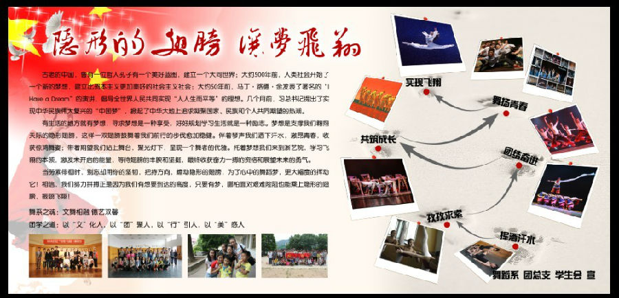 为深入学习贯彻党的十八大精神,引导全院广大学生为实现国家富强、民族复兴、人民幸福的伟大“中国梦”而勤奋学习、立志成才、积极进取,根据浙江艺术职业学院《关于深入开展“我的中国梦”主题教育活动的通知》精神,组织全院各教学单位开展“中国梦”主题教育宣传栏比赛。经过一个月的精心策划、制作,各教学系部策划制作出各具特色的“中国梦”主题宣传栏,有的反映各系教学风采和学风精神,有的反映师生对于“中国梦”的向往,有的对“中国梦”进行溯源,等等,参评作品有着较高的质量,令人耳目一新。