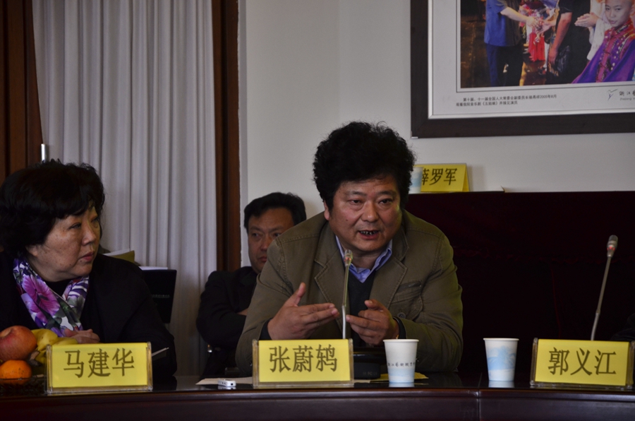 浙艺院音乐系主任郭义江教授主持研讨会。他在发言中表示,浙江民间音乐是具有鲜明特色的地域音乐,如江南丝竹、嘉善田歌、舟山号子、嵊州吹打等,至今还在城市、乡镇以及山村和海边盛传,这些本土音乐既是文化馆、歌舞团长期关注的内容,也是艺术院校在教学、科研和创作中应该融入的重要内容。他表示,浙艺院音乐系音乐表演专业是省级重点专业、省级示范性院校重点建设专业和省级优势专业,在未来三年建设规划中,将以“民族乐团”、“音乐表演合唱团”为载体,结合“乐团制”教学模式改革的深化,将浙江民间传统音乐引入课堂,使音乐专业学生在接受传统音乐教育的同时,全面了解本土音乐文化,使培养的人才在知识内容和结构方面更趋合理科学。为此,要向省内优秀创作专家团队学习和借力,充分挖掘浙江本土传统民间音乐资源,培育优秀创作团队、加强教学实践环节的投入,以期达到“积累一批教材,推出一批新作品,培养教、学、演相长的专业表演人才”的目标。