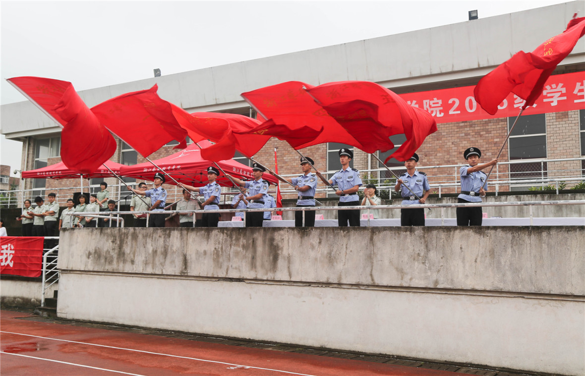 来自浙江警察学院的教官踏着铿锵的音乐,守卫着国旗出场,伴随着庄严的国歌声,国旗徐徐升起,开训仪式就此开始。