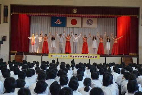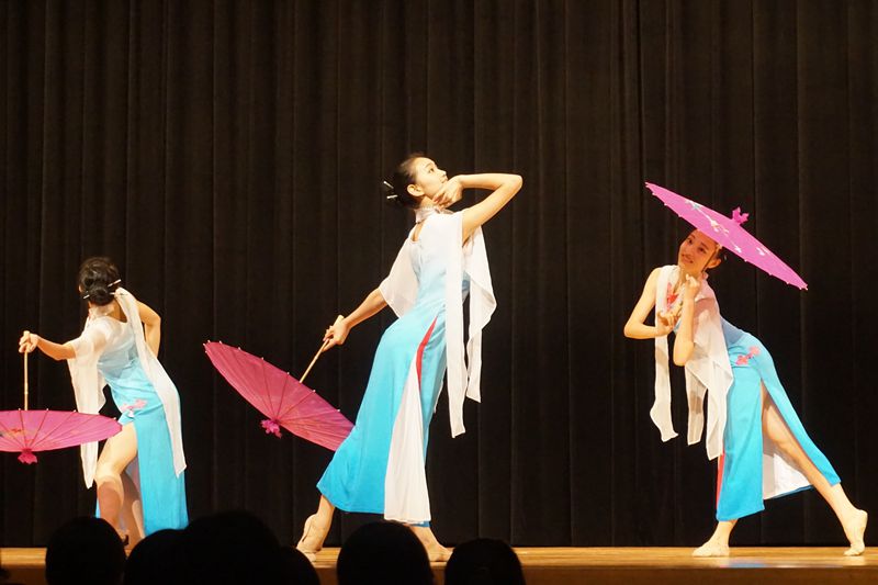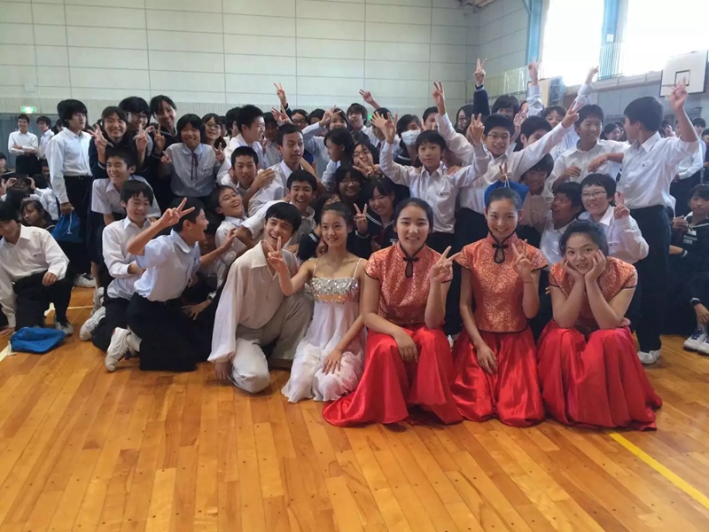 艺术团进入每个学校演出,均受到师生们的热情欢迎。艺术团师生为当地观众表演了一台充满中国民族特色的节目。民乐合奏《花好月圆》轻快明亮、悠扬婉转;女子独舞《孔雀飞来》富有民族特色的舞姿和明快的音乐令人陶醉;舞蹈《微笑之秋》展现了艺术团学生们的青春活力,展现了舞蹈美、音乐美和青春美,描绘出美好的抒情画面,感人肺腑;舞蹈《忍者学员》节奏动感,三个男生刚劲矫健的舞姿每次赢得观众阵阵掌声;笛子独奏《西湖春晓》、女子三人舞《小城雨巷》、民乐三重奏《倒垂廉》、男子独舞《恰同学少年》等精彩不断,独唱《哆啦A梦》每每让全场观众打着节拍和唱。演出过程中,每个节目结束,掌声都非常热烈。当表演《天空之城》《多啦A梦》《忍者学员》等源自日本的文艺节目时,台下学生们跟着一起哼唱,反应热烈。每场演出后的艺术交流中,当地学生一致表示对中国民族艺术的喜爱之情,连连赞叹节目“太棒了!从来没听到过这么好听的歌曲,没看到过这么好看的舞蹈!”艺术团学生还现场教授日本学生乐器演奏。多所学校则以合唱校歌或日本民歌来致谢艺术团师生。全场演出交流结束后,日本学生热情而不舍地涌到舞台前与艺术团师生们热情地交流,合影留念,连连鞠躬致谢。在社会公演中,艺术团学生还与日方艺术家共演歌曲《北国之春》《花会绽放》和舞蹈《樱幻想曲》等节目,引起当地观众的共鸣。