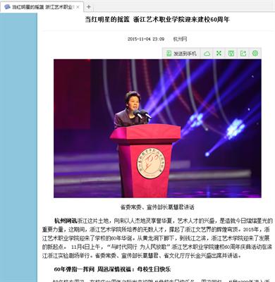 11月4日,浙江艺术职业学院举办建校60周年校庆大会暨纪念演出,浙江卫视、中国文化报、中国教育报、钱江晚报、杭州日报、都市快报等传统媒体,和浙江在线、新浪浙江、腾讯大浙网、浙江新闻客户端、杭州网等新媒体都进行了相关报道,向社会各界传递了浙艺办学理念、特色、最新成果及明星校友等信息,扩大学院影响,为学院口碑和美誉度添彩。