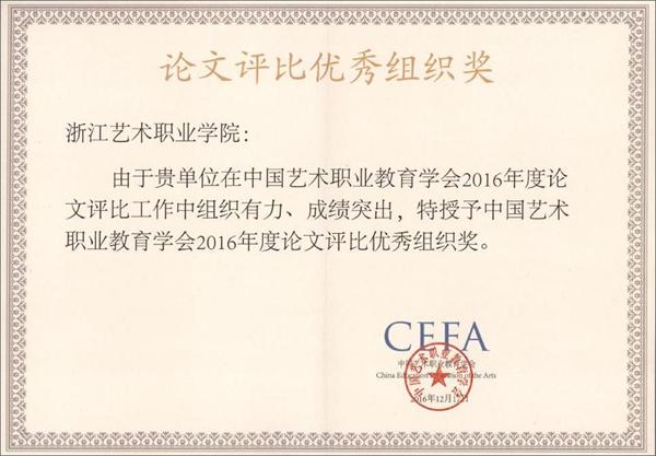 近日,从中国艺术职业教育学会传来喜讯,由浙江艺术职业学院报送的六篇论文喜获奖项。鉴于我院在本次评选活动中组织有力、成效突出,被主办方中国艺术职业教育学会授予2016年度论文评比优秀组织奖、年度特殊贡献奖。
