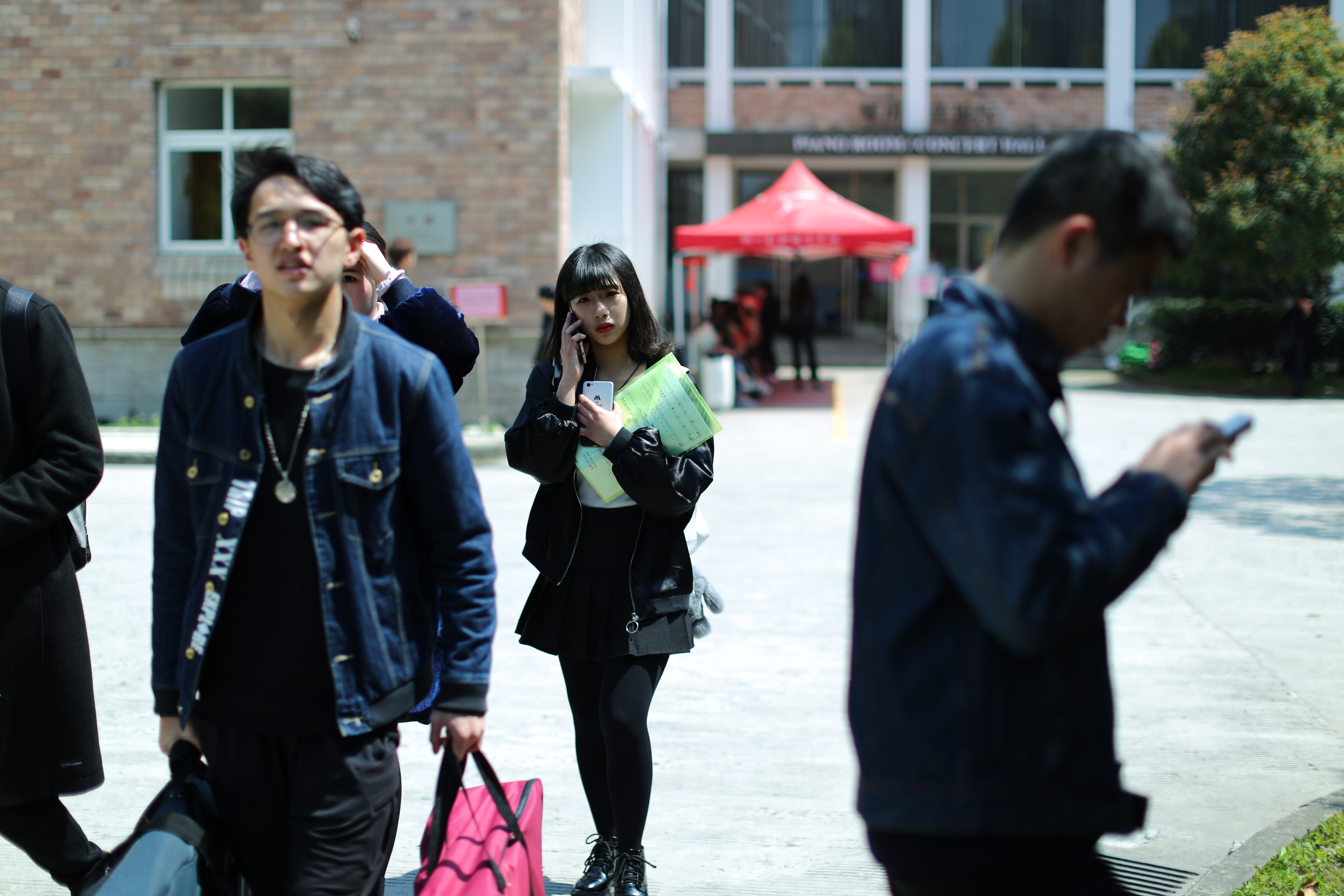 音乐系的专业考试,是先闻其声再见其人。楼道里候考的考生都在调试乐器打开嗓子,回荡着各种小声哼唱或弹拨乐器的声音,虽然没有考场里的洪亮高亢,但也有条不紊地准备着。歌舞表演专业更是各怀才艺,唱歌剧、民歌、美声的,跳民族舞、现代舞的,让人目不暇接。声乐考场外考生排着队时还在复习手中乐谱。