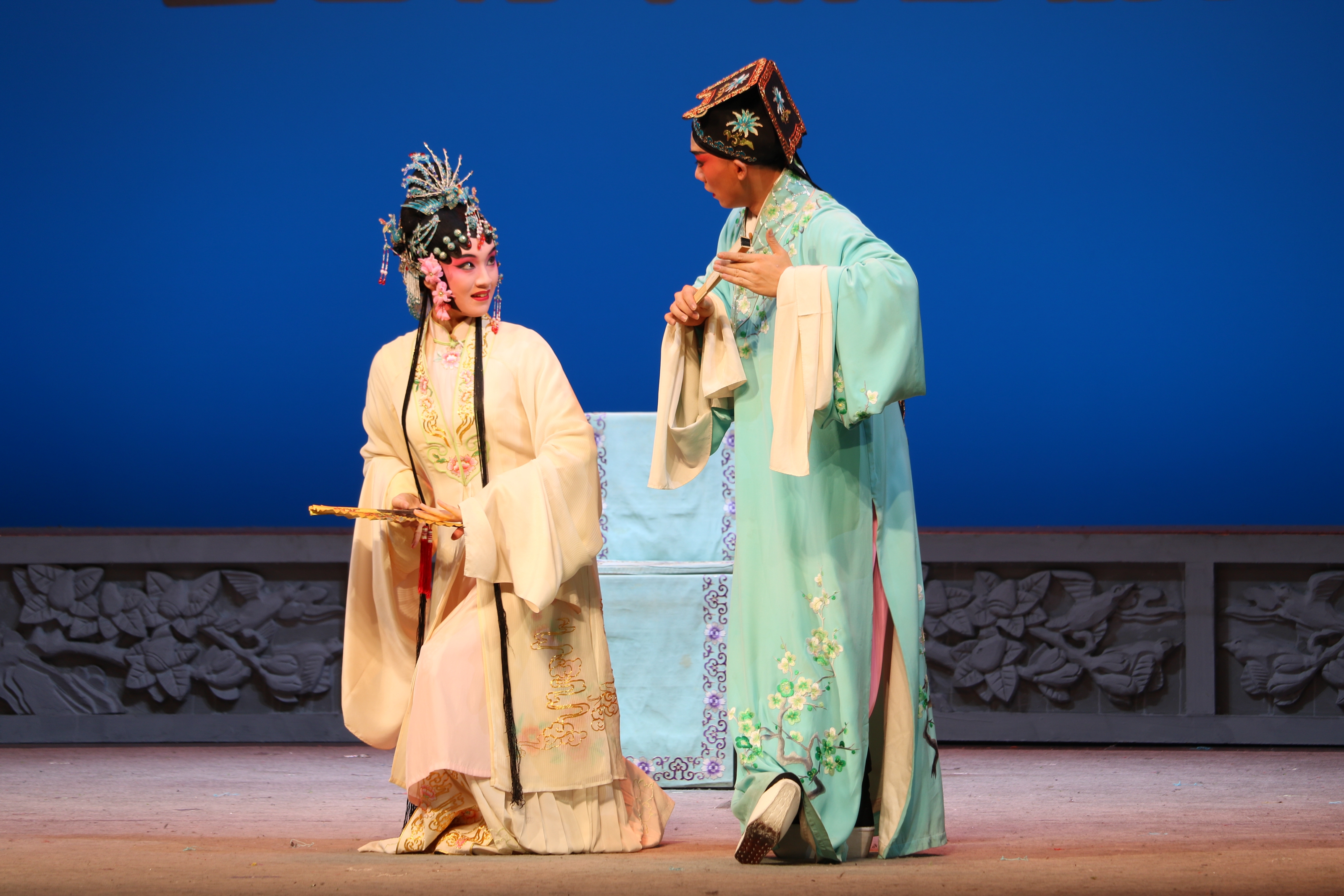 比赛现场胜利剧院座无虚席,走道上也站满了人,不少观众扒在看台边热切地关注着比赛进程。评委有方汝将、石玉昆、杨小青、汪世瑜、谷好好、周冠均、茅威涛、赵志刚、翁国生等(按姓氏笔画排序)浙江戏曲界大咖和上海、江苏的名家,被媒体描述为“戏曲界的半壁江山都来了”。指导老师们也在台前台后打理着,为学生梳妆整理衣物,鼓励即将上台的学生。随着幽幽戏韵在场上响起,杜丽娘的一眉一眼、一颦一笑尽显眼前,“有情人如丽娘者,乃可谓之有情人耳。情不知所起,一往而深”,吴心怡可谓将杜丽娘的多情演绎得活灵活现,柔美动人。王恒涛以巾生的扮相登场,文生巾,花褶子,粉彩裤,厚底靴,活脱脱一个白面书生相,却又流露几分多情之性。而倪润志则在戏中女扮男装,穿上了高靴,与对手打斗,利用剑椅完成一系列技巧,看得台下掌声迭起,惊心动魄。