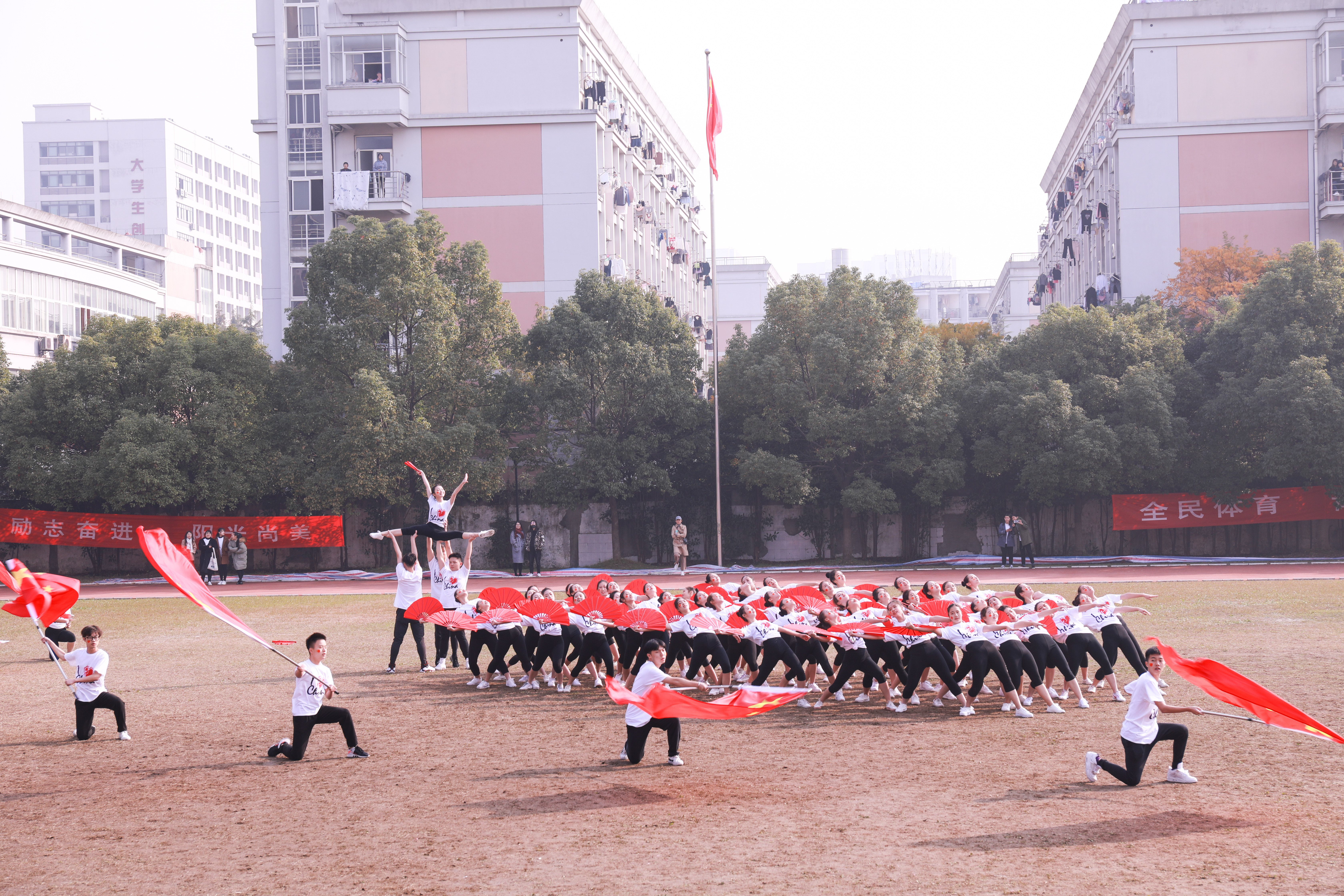 开幕式上进行了广播操和团体操的比赛。广播操比赛中,同学们用整齐规范,有力到位的动作展现了浙艺学子积极进取的精神风貌。团体操的比赛堪称精彩绝伦,各系学子精心准备,结合专业发挥了各自的特长,有舞蹈,有RAP,展现了艺术与体育的糅合之美和综合类艺术院校学子的多才多艺。同学们的激情,温暖了这个冬日。相信即使在若干年后,浙艺田径场上的每一幕都是值得回忆的青春。
