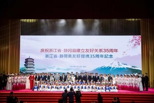 文艺演出在浙江艺术职业学院、浙江大学表演的“江之情”合唱《美丽浙江》中拉下帷幕,在潘冠泽、朱卓凡、池田友希、川畑晓绘等领唱下,优美的歌声中,描绘了35年里,在美丽浙江的朋友圈留下无数与静冈的甜蜜,寄托祝愿中日人民友好,功在当代,利在千秋,共同牵手勇立潮头,扬起风帆,百舸争流,共筑美好明天。