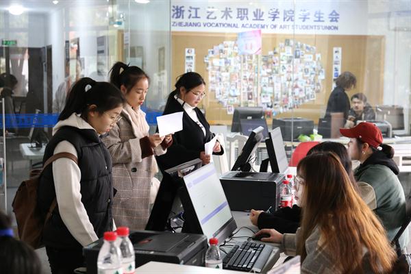 秋冬时节的浙艺校园,金黄色格外醒目,中心广场两旁的银杏树将落叶洒落在脚下依然青青的草坪和蓝色的步道上,给冬日里的校园增添了几分温暖。今天(30日)是考生们报到的日子,一进校园,本次考试的导示牌便映入眼帘,交代了报到、候考、考场等具体信息。早晨刚开始时报到人数还不多,临近中午时出现了高峰期。考生们带着身份证、职业技能考试报名证等证件进行现场确认。