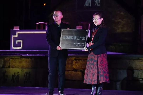 浙江艺术职业学院院长黄杭娟与浙江小百花越剧团党总支书记刘建宽、湘湖国家旅游度假区管委会副主任韩钟签约,为浙江做客文化创意有限公司罗可歌导演工作室授牌。