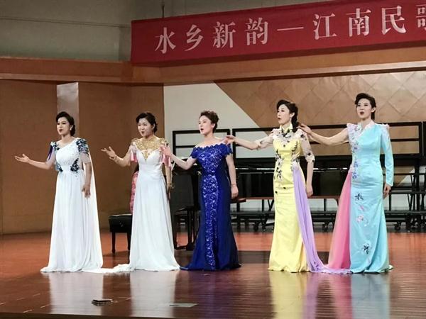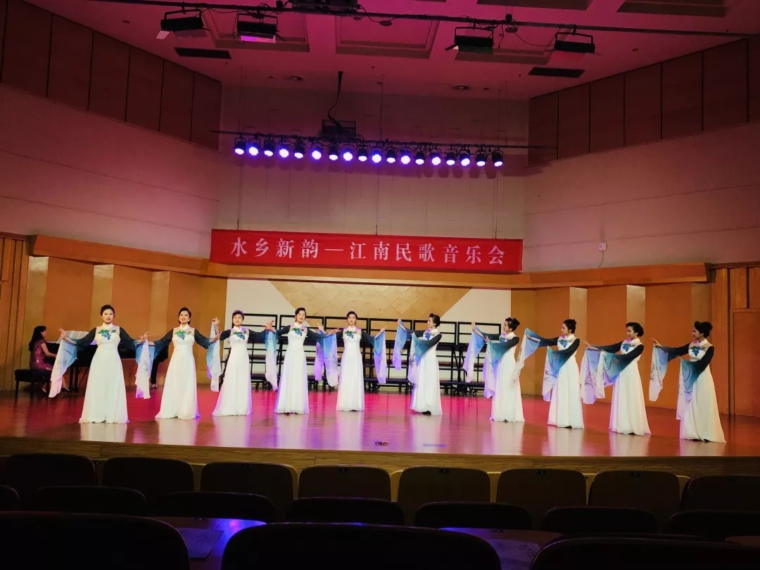 “溪水清清溪水长,溪水两岸好风光……”音乐会在《忆江南·新采茶》的旋律中开启。这首改编自家喻户晓的江浙民歌《采茶舞曲》的新版女声小组唱作品,由10名女生演绎。在我国民族民间音乐大家庭中,江浙一带的民歌以其清新委婉、活泼灵动的特质占有重要位置。音乐会上,江苏民歌《紫竹调》《四季相思》《拔根芦柴花》是耳熟能详的江南曲调,用女声重唱、独唱的形式展现出原样风貌。女声联唱《茉莉花》合着富有爵士乐韵味的钢琴伴奏,使这首地道的江南民歌有了现代新民歌的意味。用温州方言演唱的《对鸟》由刚刚获得2019全国职业院校技能大赛声乐赛项二等奖的张銮楠同学带来,这首在温州几乎人人会唱的地方民歌收获了现场观众的热情欢迎。创作于上世纪九十年代的《茶山情歌》最初由歌手杨钰莹用通俗唱法演绎,在这次音乐会上,4位女生用载歌载舞的表演唱形式再度将这首江西民歌搬上了舞台,别有一番风味。用沪语演唱的上海民歌《啥鸟飞来节节高》,透过婉转的曲调,吴侬软语的江南韵味油然而生。