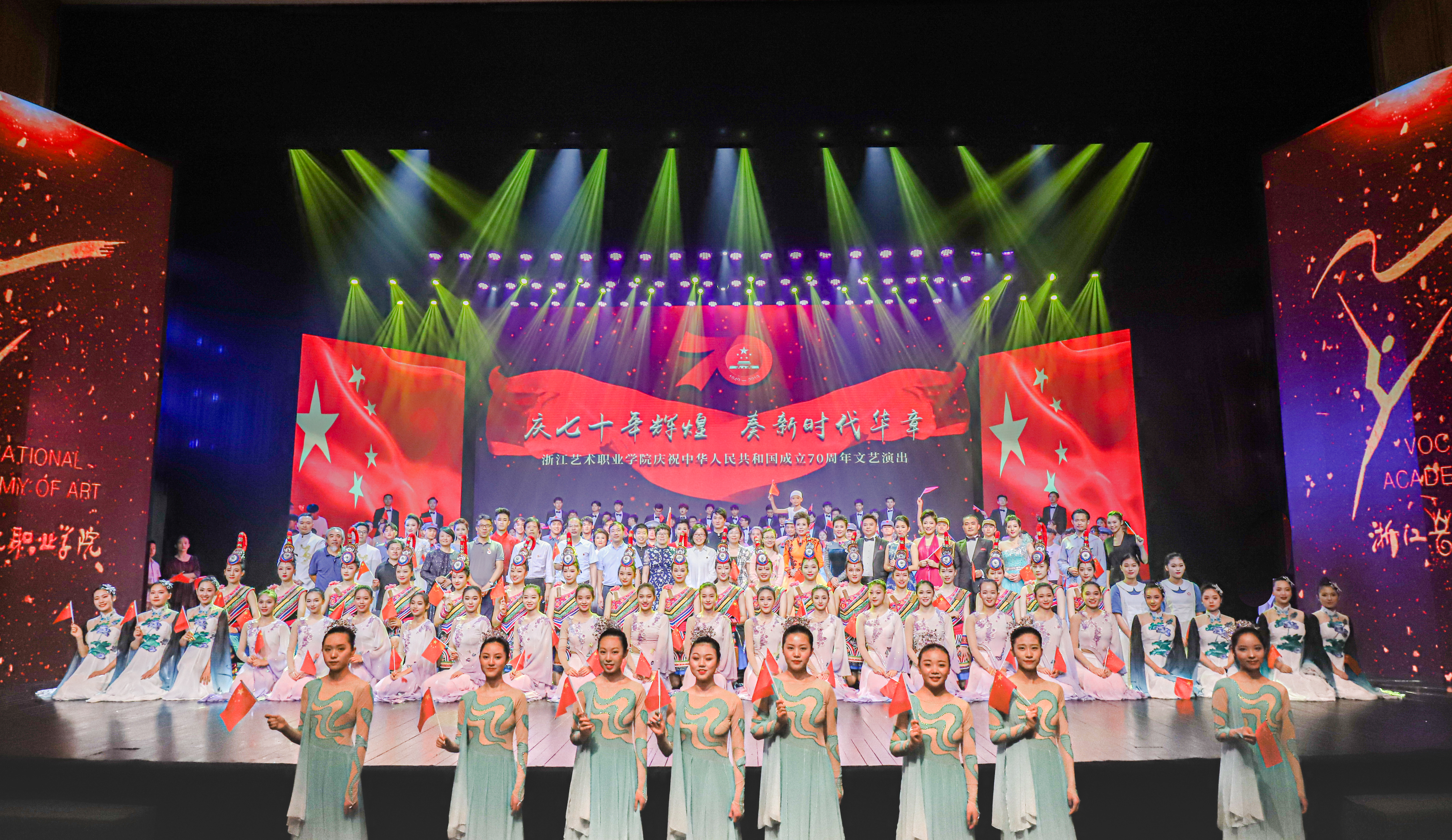 9月27日晚,浙江艺术职业学院庆祝中华人民共和国成立70周年文艺演出在实验剧场隆重举行。浙江中医药大学、浙江警察学院、浙江商业职业技术学院等兄弟院校领导、滨江浦沿街道相关领导,学校党委班子成员、全体处级干部,滨江六校师生代表等欢聚一堂、观看演出,共贺新中国70周年华诞。