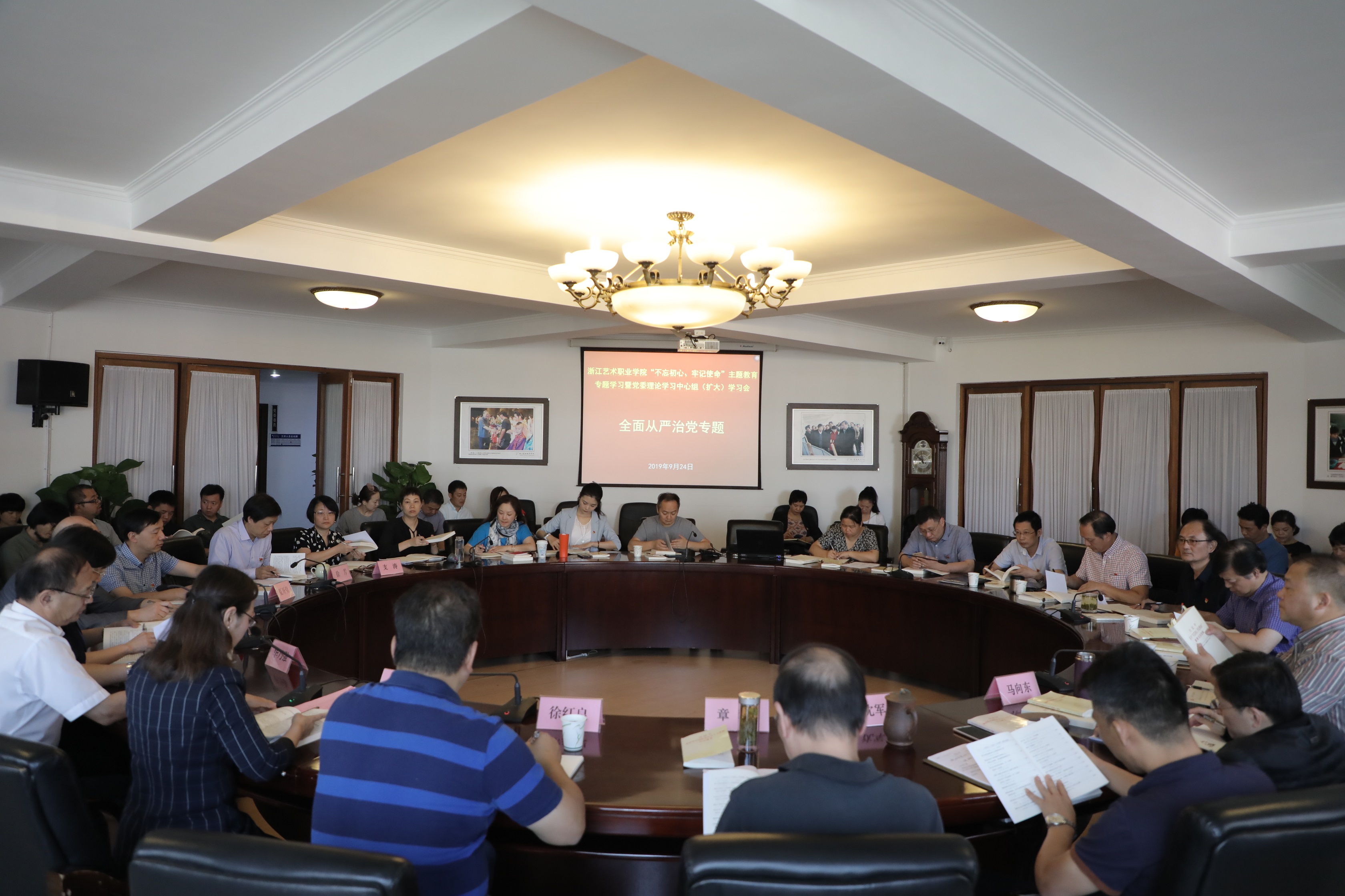 9月24日上午,浙江艺术职业学院召开“不忘初心、牢记使命”主题教育第二次专题学习暨党委理论中心组(扩大)学习会,就“全面从严治党”专题开展学习。省委第十四巡回指导组组长华乃强作指导讲话。党委书记朱海闵主持会议。党委副书记、院长黄杭娟领学《习近平关于“不忘初心、牢记使命”重要论述选编》相关篇章并作中心发言。巡回指导组组员徐红良、徐旻出席会议。校党委班子成员、处级以上干部参加会议。