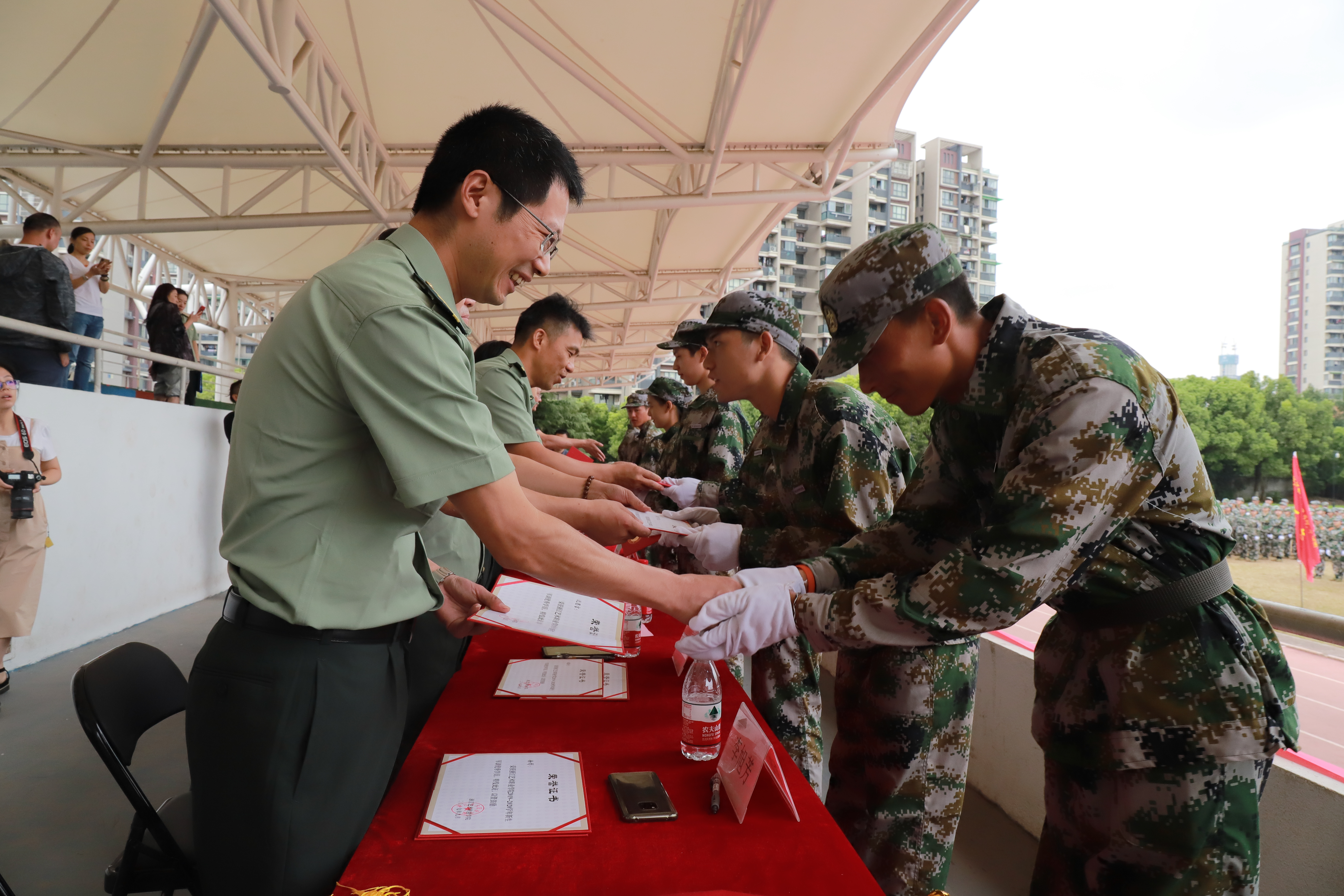 夏开堂宣读军训先进个人和先进集体名单,对新生进行了检阅。