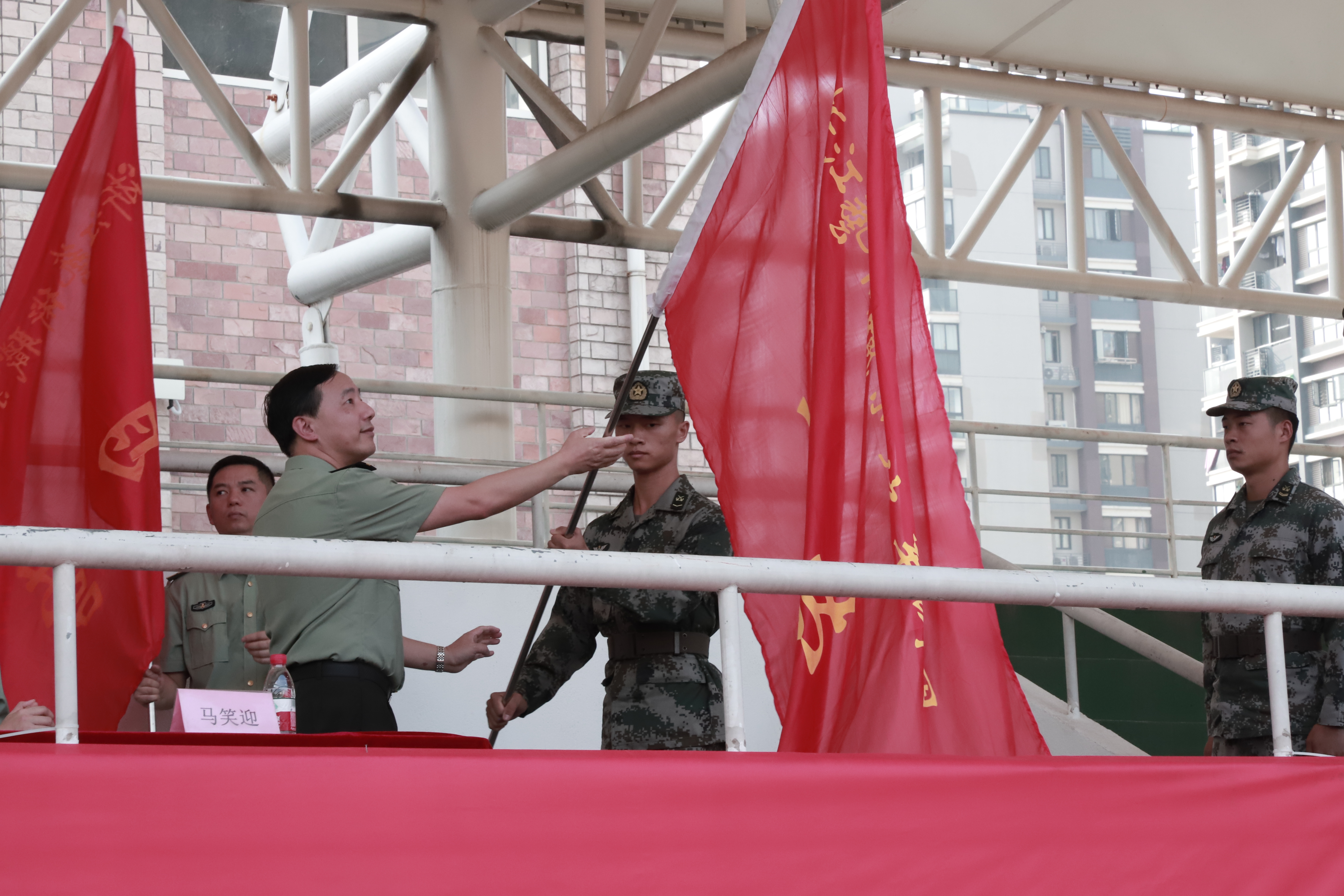 夏开堂宣读本次军训团营以上干部及教官名单,并为本次军训团授旗。