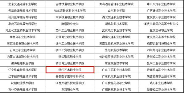 10月25日,教育部网站发布教育部、财政部《关于中国特色高水平高职学校和专业建设计划拟建单位的公示》,来自全国的197所高职院校榜上有名,其中,高水平学校建设单位共计56个,高水平专业群建设单位141个。浙江艺术职业学院位列高水平专业群建设单位名单,为全国唯一一所入选的综合性高职艺术院校。