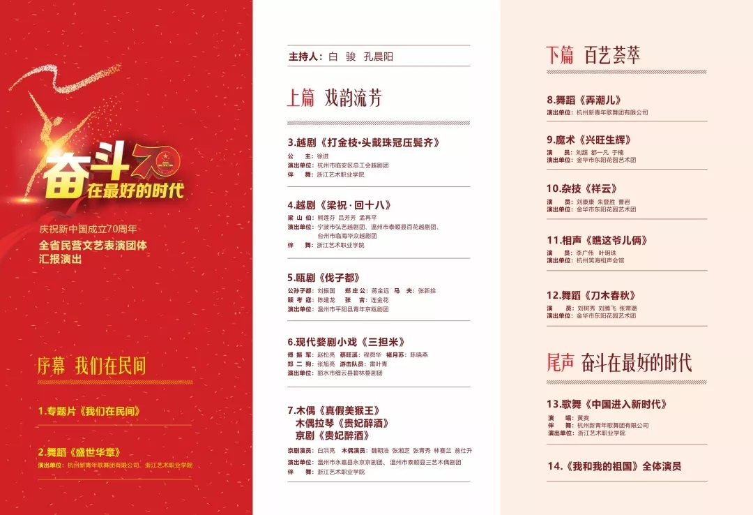 23日,由浙江省文化和旅游厅主办、浙江艺术职业学院承办、浙江艺术职业学院继续教育学院执行的“奋斗在最好的时代”——庆祝新中国成立七十周年浙江省民营文艺表演团体汇报演出于浙江省人民大会堂上演。这是一次集聚全省各地一线民营文艺资源的盛会,也是长期以来,浙艺立足优厚艺术教育优势,帮扶各地民营团体以优秀作品和人才面向民间、走向民间、扎根民间的成果展示。习近平总书记强调,“不能在为了谁的问题上产生偏差,否则文艺就没有生命力。”通过每年民营文艺表演团体汇演,铸造一支支有先进文化意识的基层文化队伍,来满足人民群众日益增长的精神文化需求。
