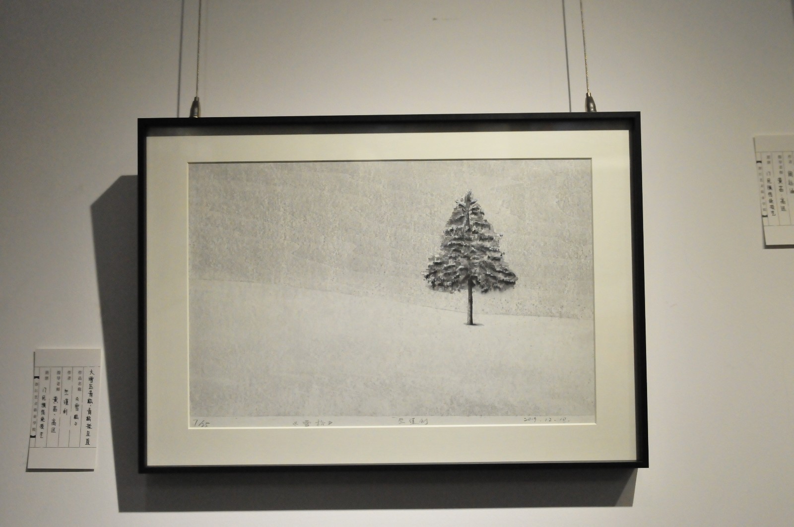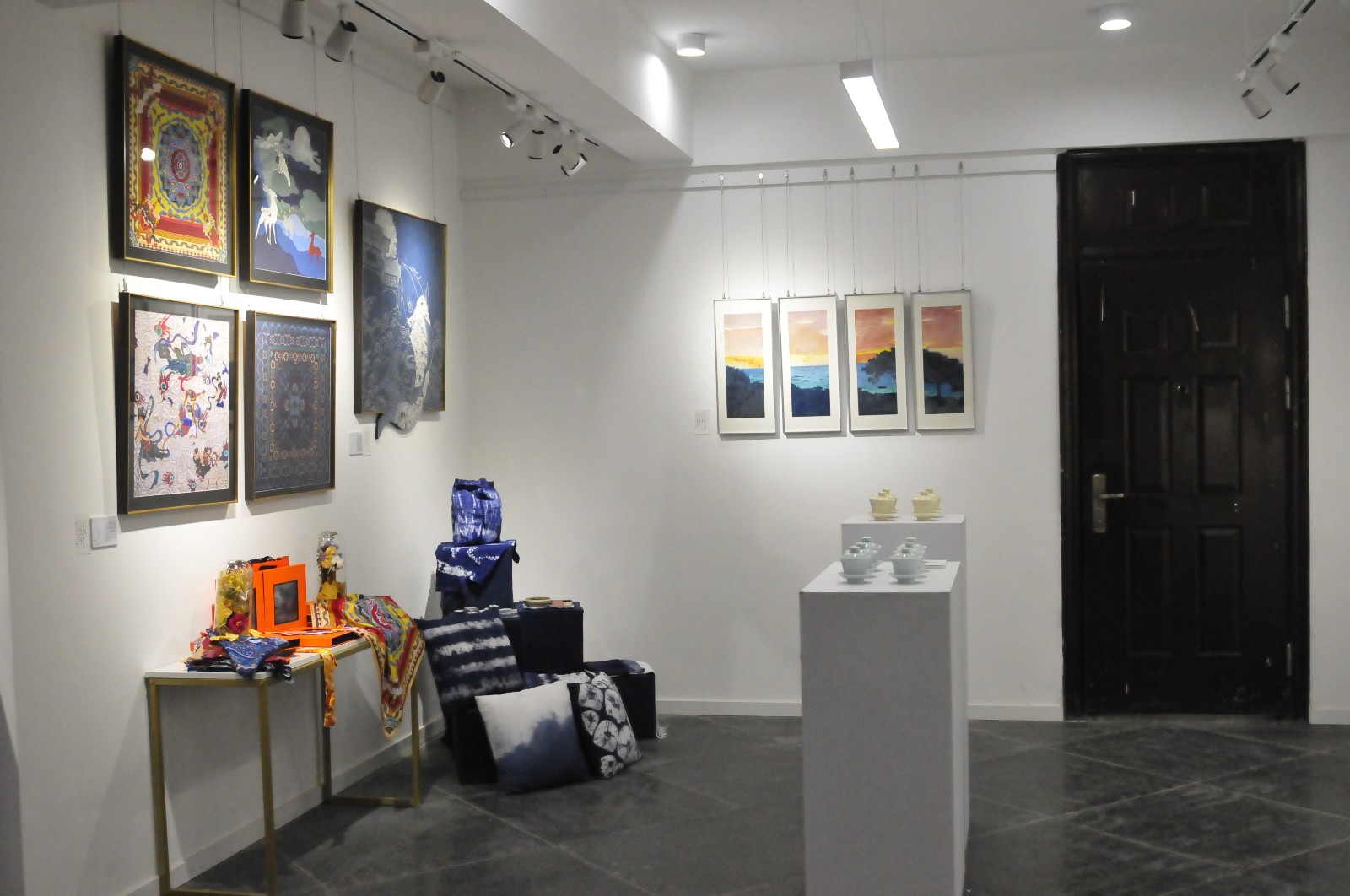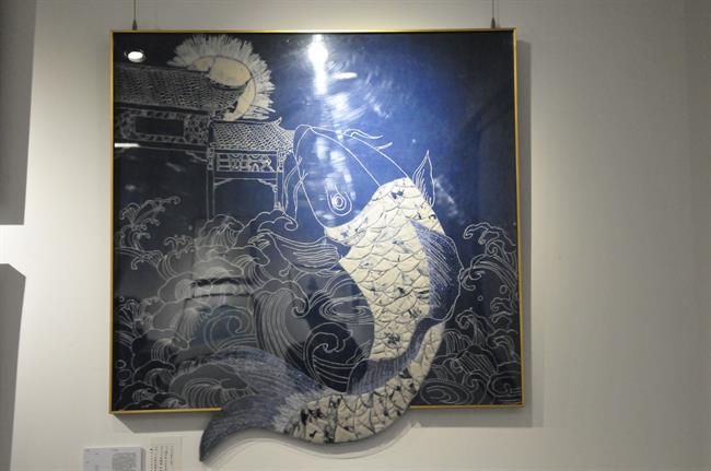 走进展厅,就是放置在玻璃柜中的瓷器,莹润雅致。再往前走几步,映入眼帘的是17级民传班同学们的各色作品,分为五组,代表了五种不同的民族传统技艺:青瓷烧造、木刻水印、真丝彩绘、石雕、扎染。