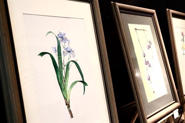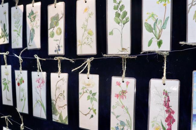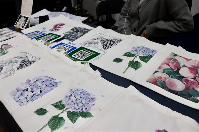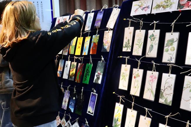 步入展厅,迎面有毕业班的同学在写书法,边上是展出的许多衍生品,布袋、书签、明信片,上面的花草以及一些设计感的涂鸦小插画,都是17级展示班同学自己手绘的。
