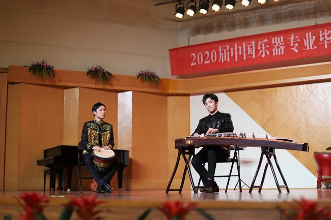 扬琴二重奏乐曲《古道行》,毕业生们将作品演奏得苍劲雄壮、动人心魄,敲击的每一个音符仿佛都在追寻中华民族生生不息的民族之魂。由叶思驿、周博带来的二胡独奏《洪湖主题随想曲》,将观众们带入抗战时期,重现了女英雄韩英为革命事业视死如归“砍头只当风吹帽”的大无畏精神。