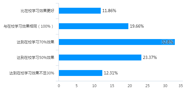 31.52%学生认为线上学习比在校学习有更好效果或效果相同,32.8%学生认为达到70%效果,12.31%学生认为学习效果不足30%。线上教学虽然总体良好,但线上、线下学习的效果仍然存在差别,线上教学还有一定提升空间。