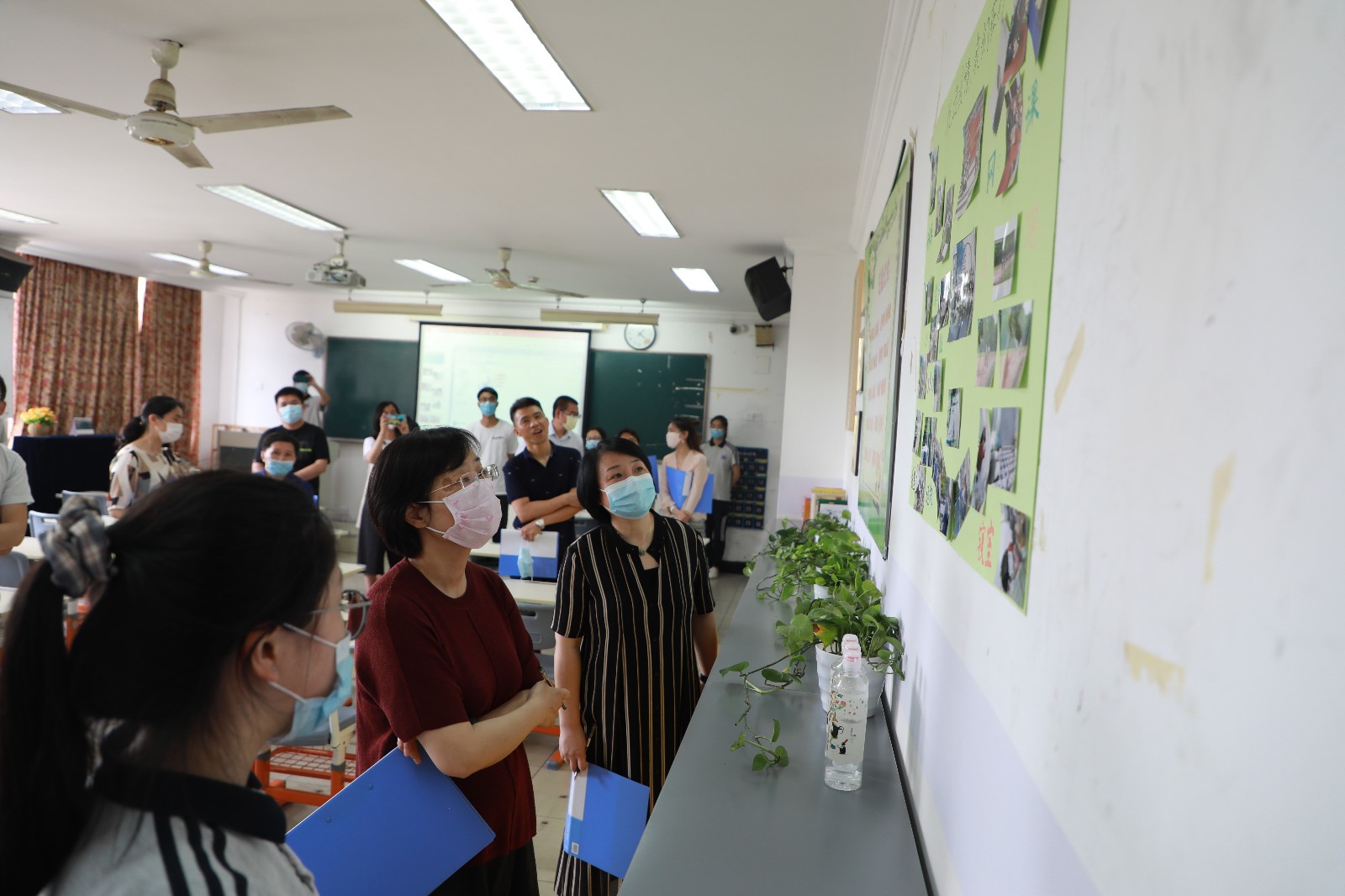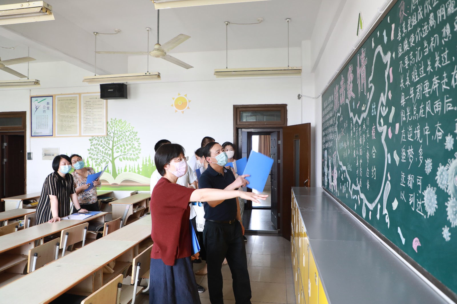 5月18日,校党委书记朱海闵、党委副书记夏开堂、副院长沈军甫、支涛、党委委员、宣传部部长马向东,各系部书记、职能部门负责人对参赛的16个班级教室进行打分。评比现场,学生们当起讲解员向评委们介绍板报主题、墙面设计,学生们还展示了疫情主题专业节目。
