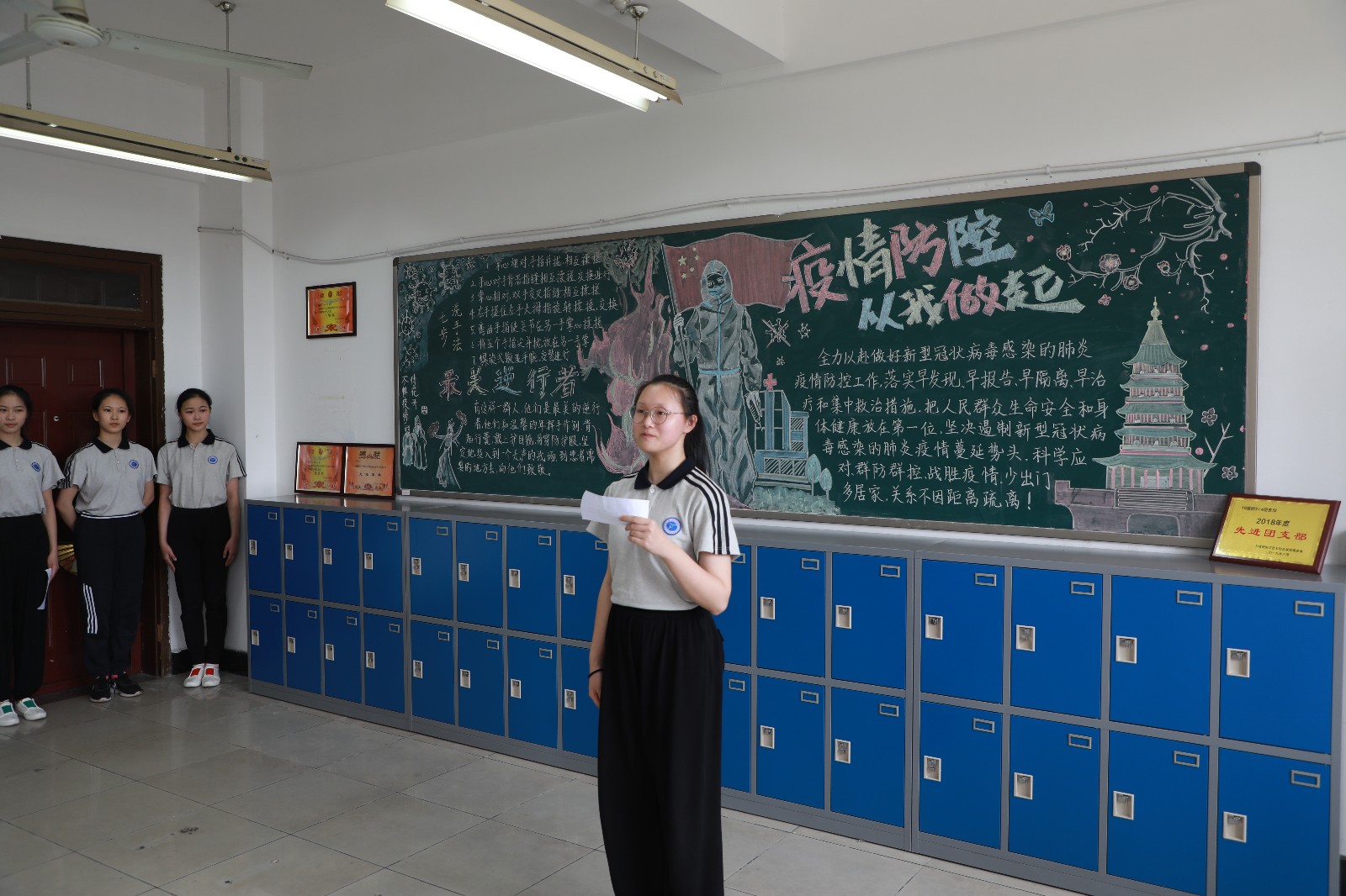 在墙面美化中,同学们发挥奇思妙想,把教室墙面装饰得丰富多彩。手绘抗疫海报、班级防疫流程图和预防新冠病毒知识宣传板,琳琅满目,还有的班级在墙上做了一个角落,名为“我们都是收信人”,上面贴满了同学们读了习总书记给北京大学援鄂医疗队全体“90后”党员的回信之后的感悟。