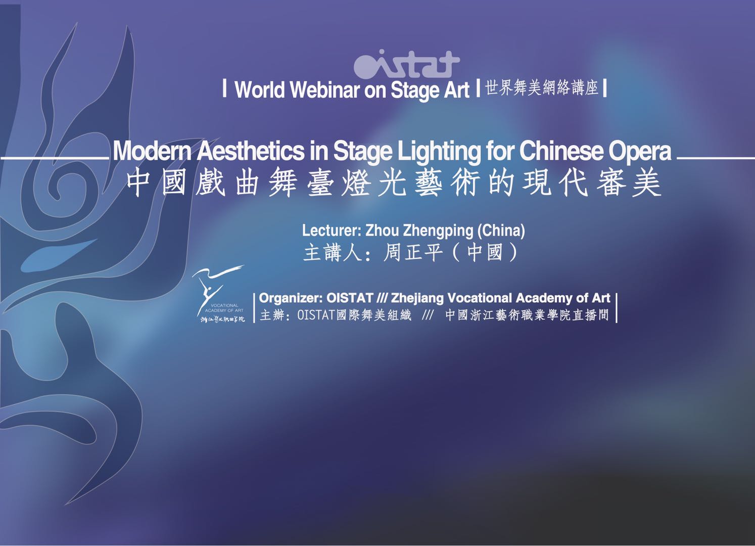北京时间6月27日晚22:30,受国际舞台美术组织OISTAT邀请,著名“灯光诗人”周正平通过浙江艺术职业学院直播间,面向全球进行了近两个小时的直播演讲,向全球同行和观众分享了美轮美奂的中国戏曲舞台灯光艺术,不仅展现了中国戏曲意蕴之美,同时也让世界看到了中国舞美设计师们独有的东方美学追求。