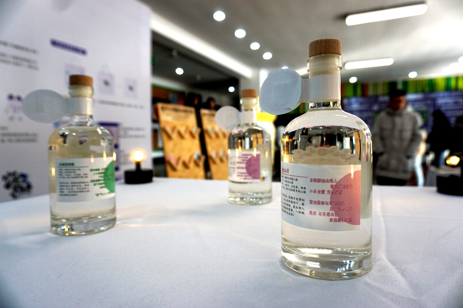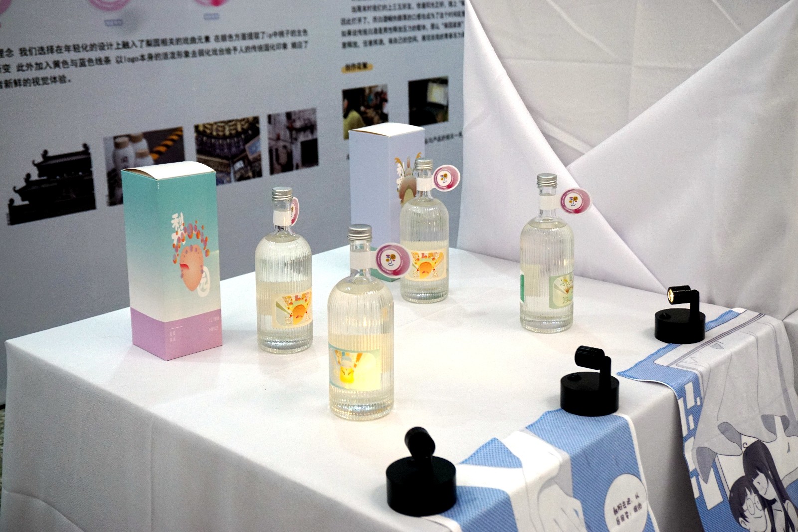 同时,我们为边村的“同山烧”设计了瓶身、瓶贴和瓶盒,打造了5个IP形象,与当地的烧酒厂达成合作,对方免费供应毕业展所需烧酒,我们允许其使用此款设计一年。