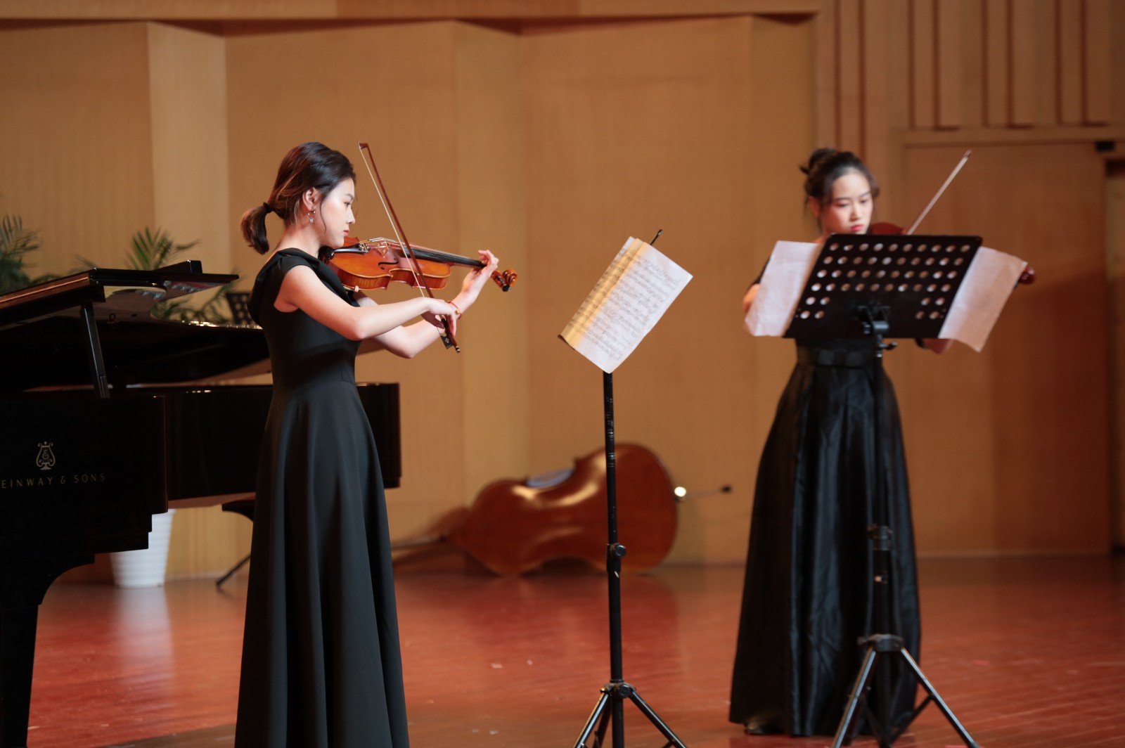 钢琴与小提琴合奏曲《组曲为两把小提琴与钢琴而作》演奏中,两位小提琴手与钢琴手的默契配合,使两种琴音融洽地交织在一起,让听众们深刻地感受到莫什科夫斯基风格的异国情调。