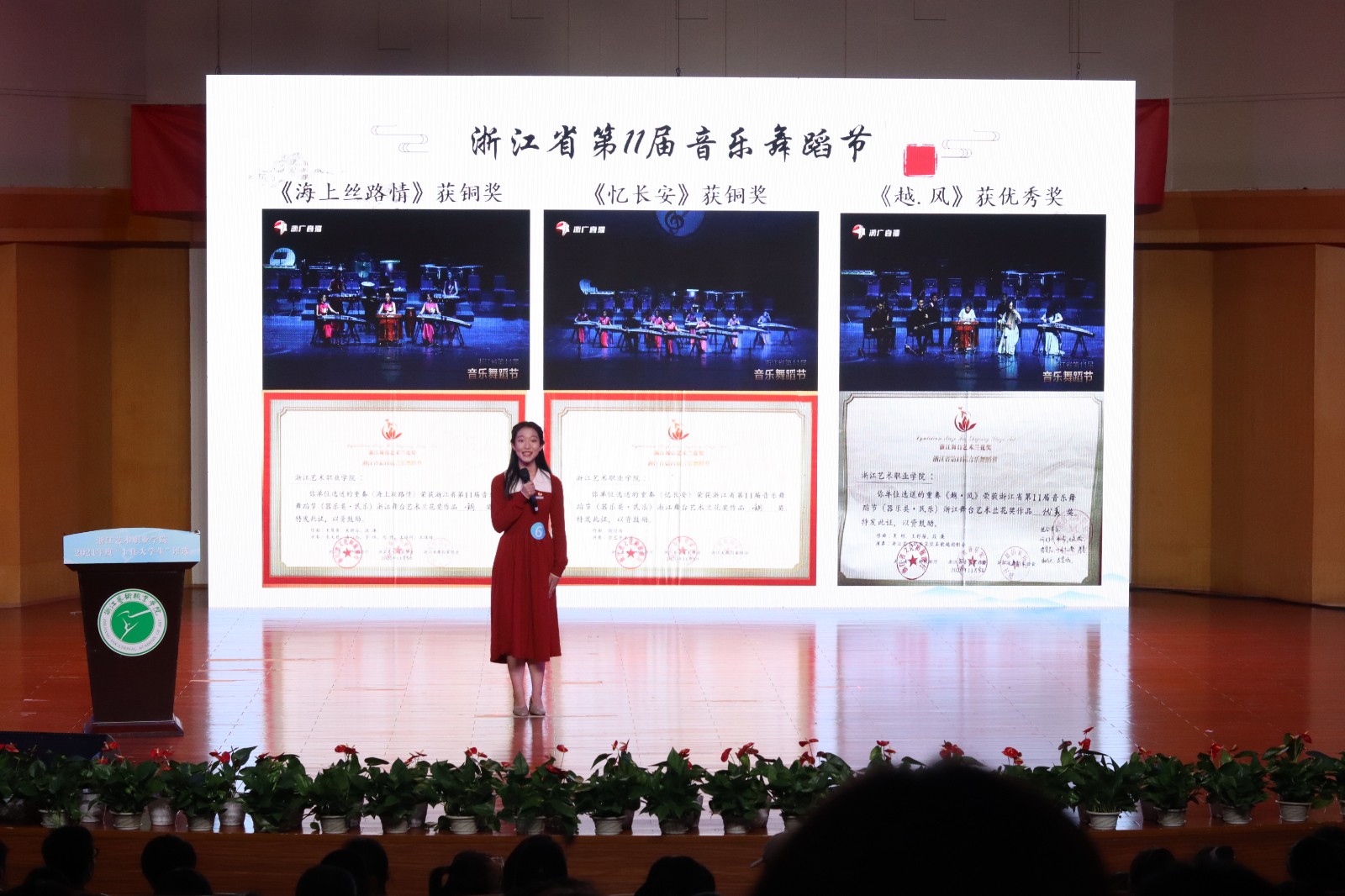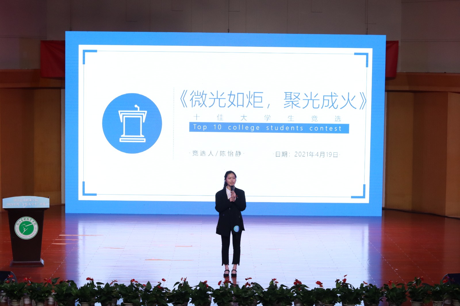 浙江艺术职业学院2021年“十佳大学生”评选活动现场展示于4月19日晚在音乐厅举行。校党委书记薛亮,党委副书记夏开堂,副院长沈军甫、支涛,党委委员、宣传部部长马向东出席,浙江省教育厅教育发展中心副主任章正春和浙江音乐学院、杭州医学院、浙江旅游职业学院、浙江机电职业技术学院、浙江商业职业技术学院等校党委学工部主要负责同志应邀出席并担任评委。